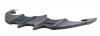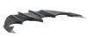This Batarang is made of black rubber cast in the stylized shape of a bat with silver-color paint applied to the tips of the wings and silver-color highlights meant to look like exposed metal showing through scratches in the finish. It exhibits some scuffing from use, wear to the wing tips, and bits of untrimmed flash around the edges. Dimensions: 3.5" x 6.25" x 0.5" ( 9 cm x 16 cm x 1.5 cm ).