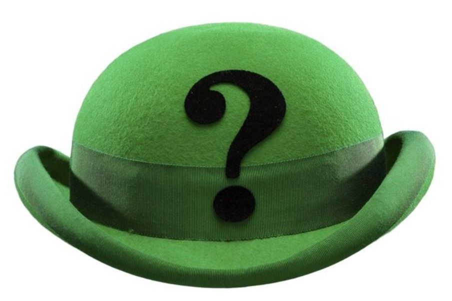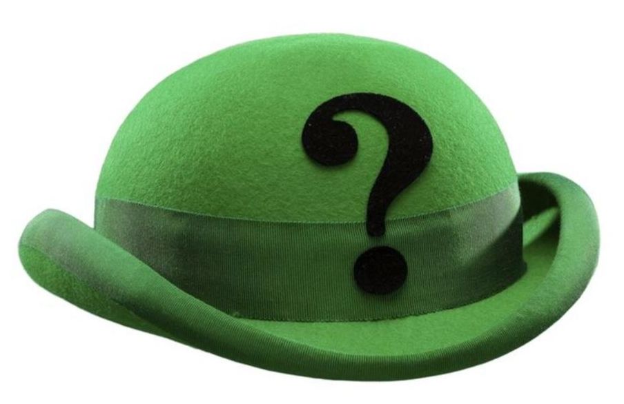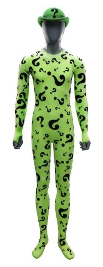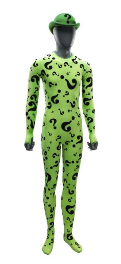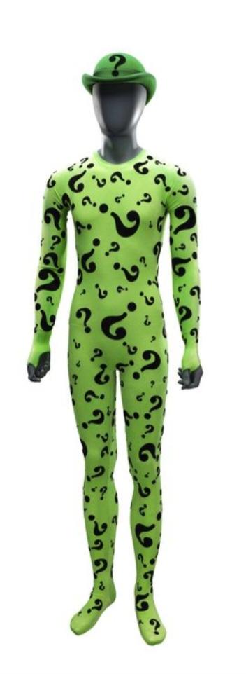 The Riddler's green unitard costume and hat from Batman Forever. After having his invention rejected by Bruce Wayne, the disgruntled Edward Nygma donned his green unitard as The Riddler and partnered with Two-Face to implement his brainwave transmitting device throughout Gotham City.