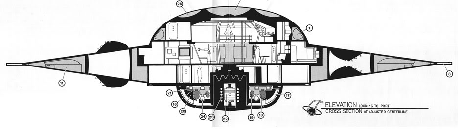The film's blueprints for the command deck show it to have a central circular "navigation center" with a transparent globe centered on a small model of the starship. Around this central space are a number of wedge-shaped rooms, including: