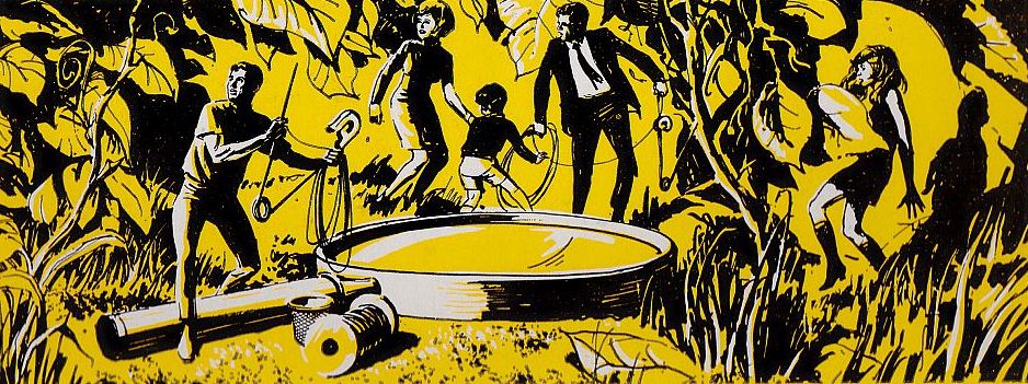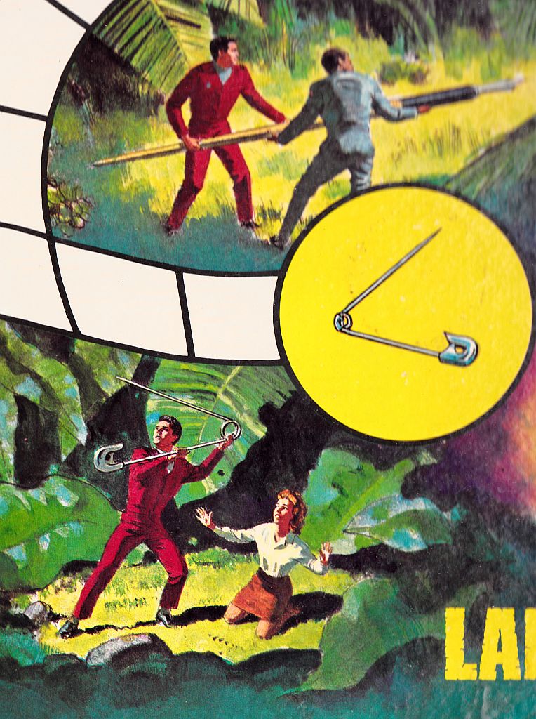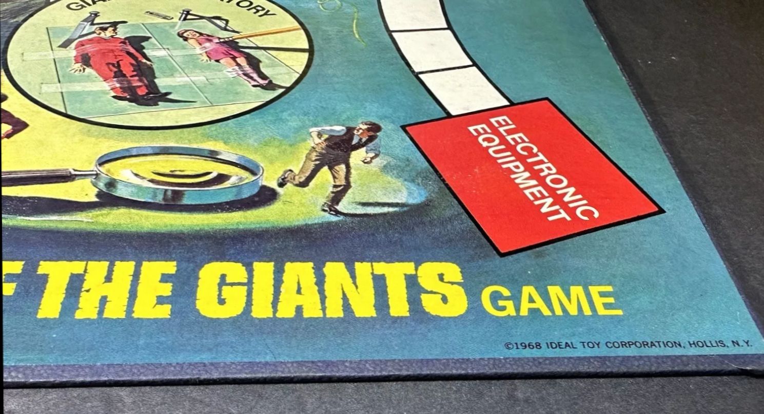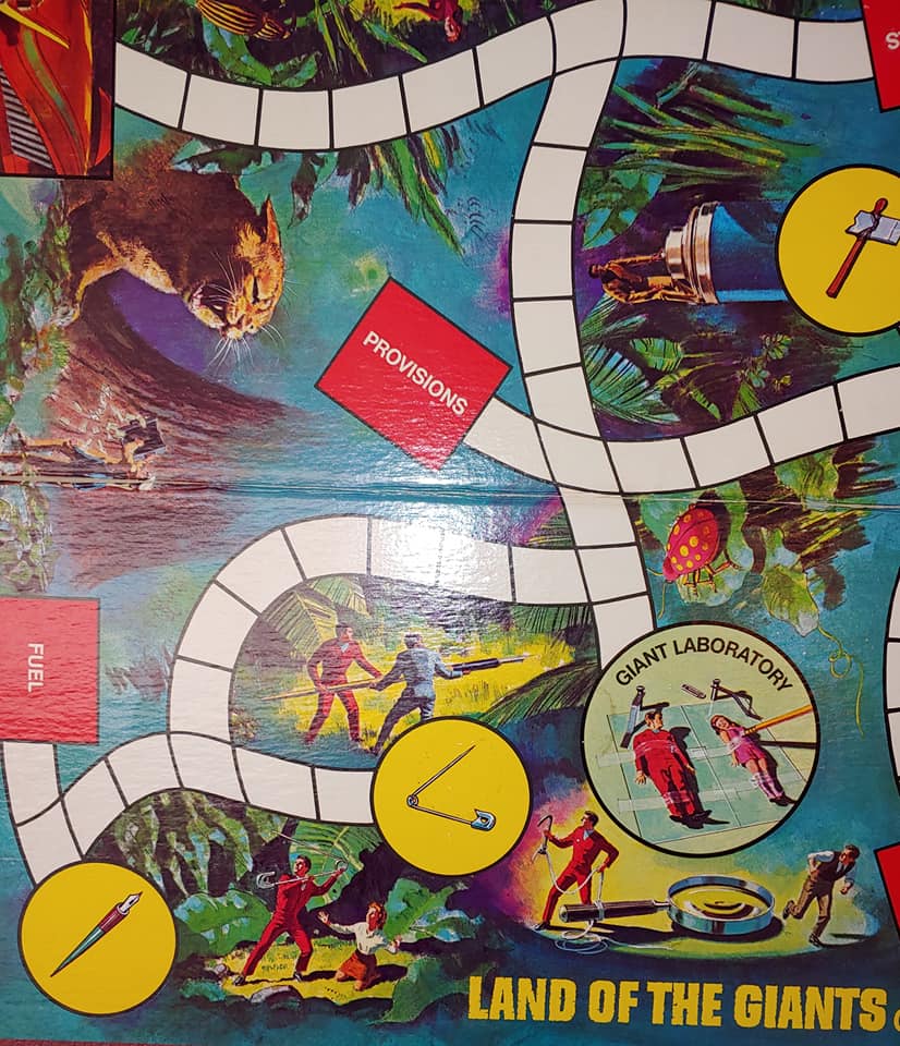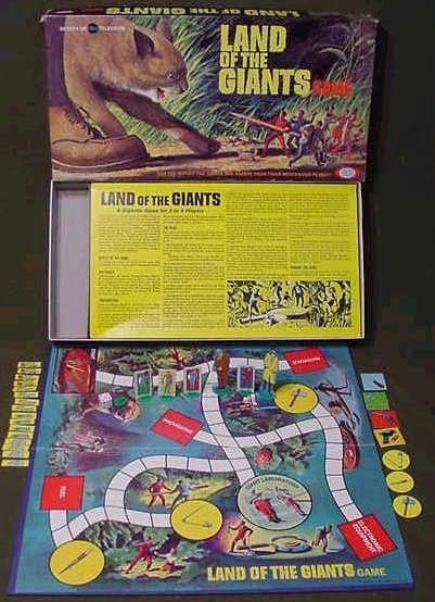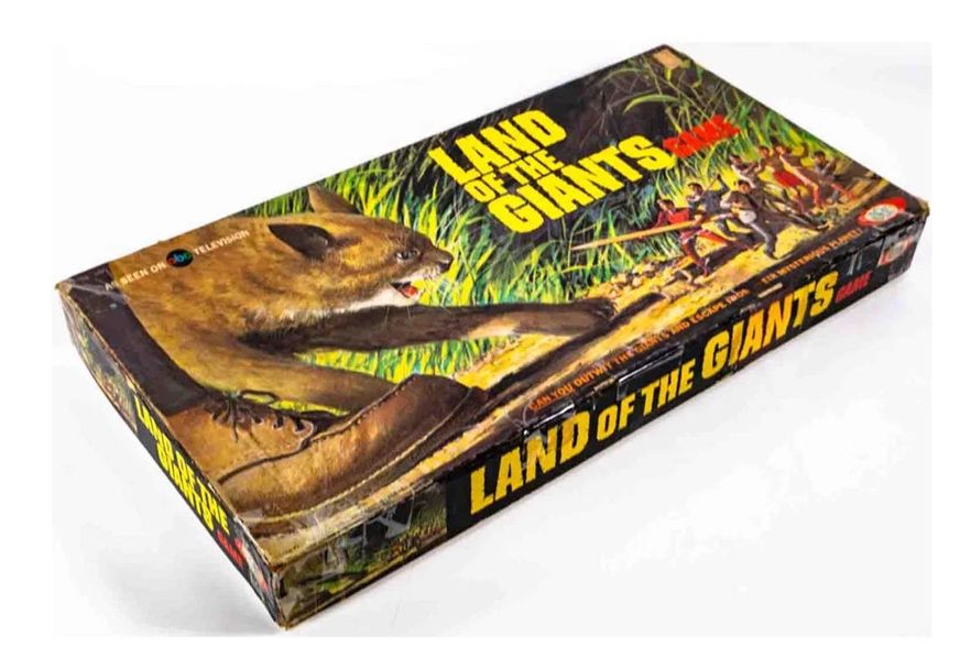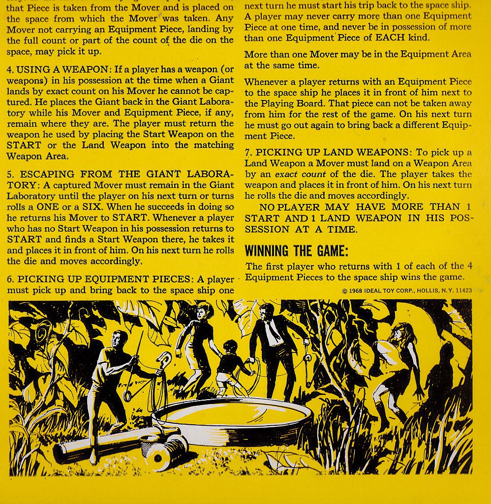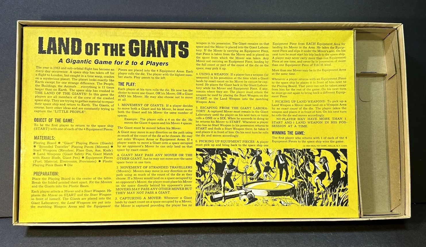 This game is made in 1968 by Ideal Toy Corp. This was a TV series on ABC by Kent Productions 20th Century Fox Film Company. Can you outwit the Giants and escape from their mysterious planet? A Gigantic Game for 2 to 4 players. The first player who returns with 1 of each of the 4 equipment pieces to the spaceship wins the game.