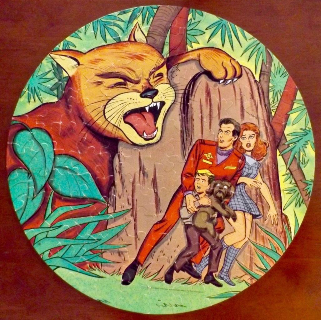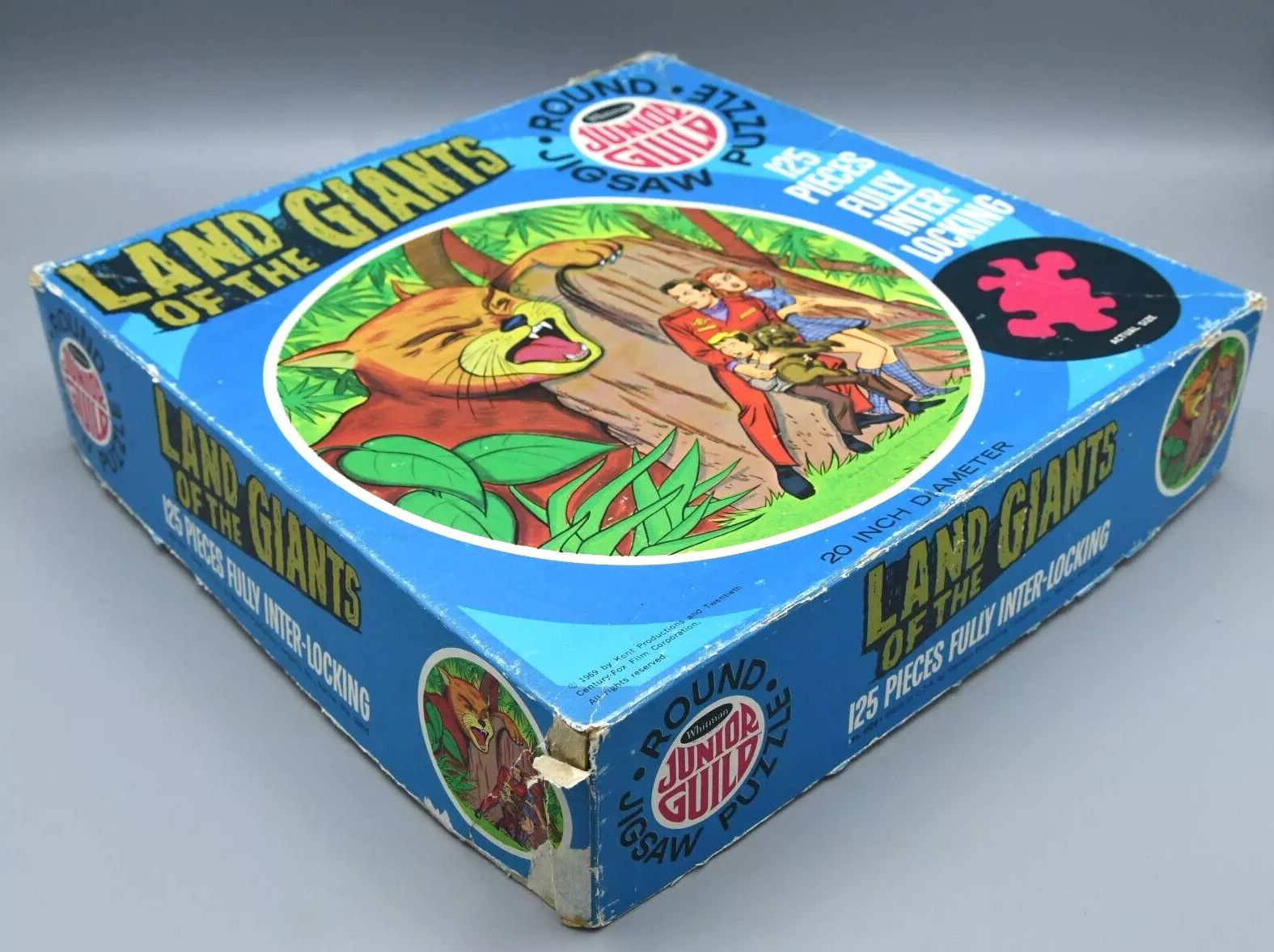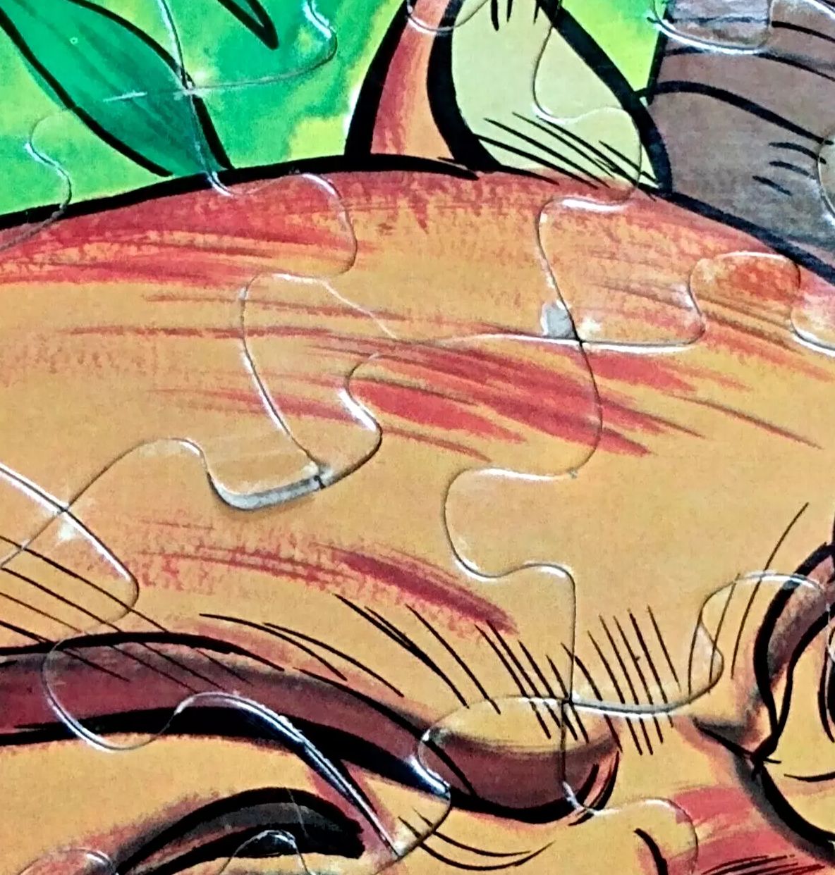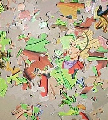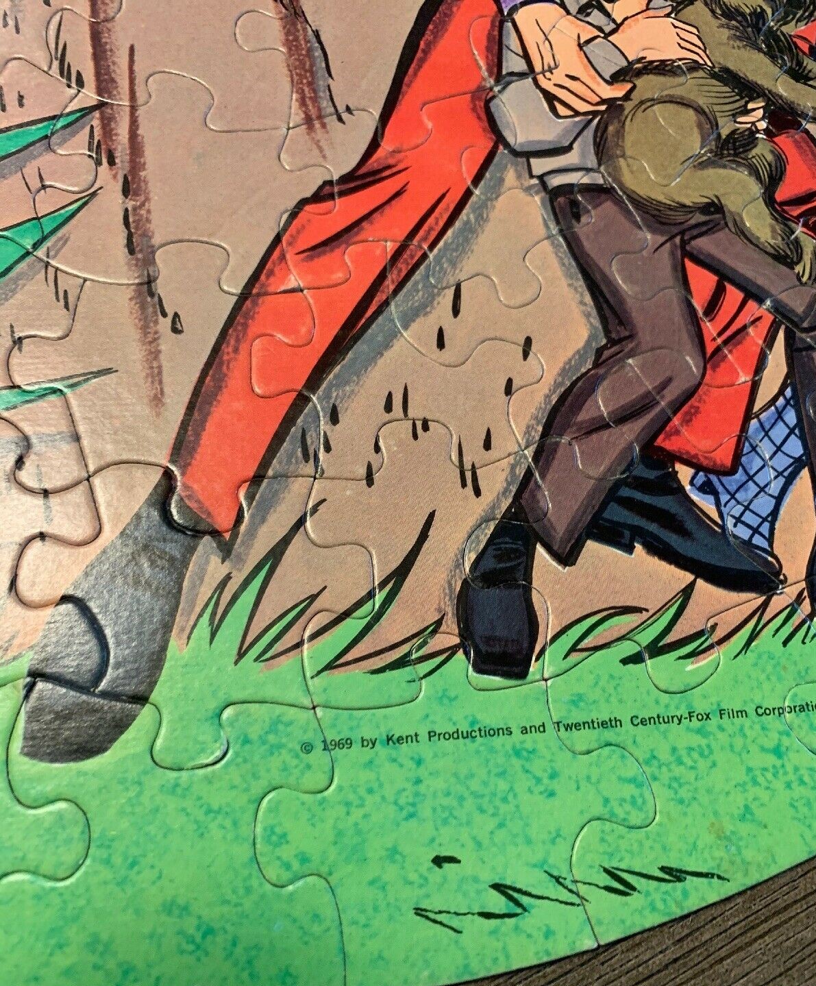 Issued by Whitman Junior Guild in 1968. A 125 piece puzzle forming a 20" round puzzle of a painting of three characters being chased by a giant cat.Value: $50.