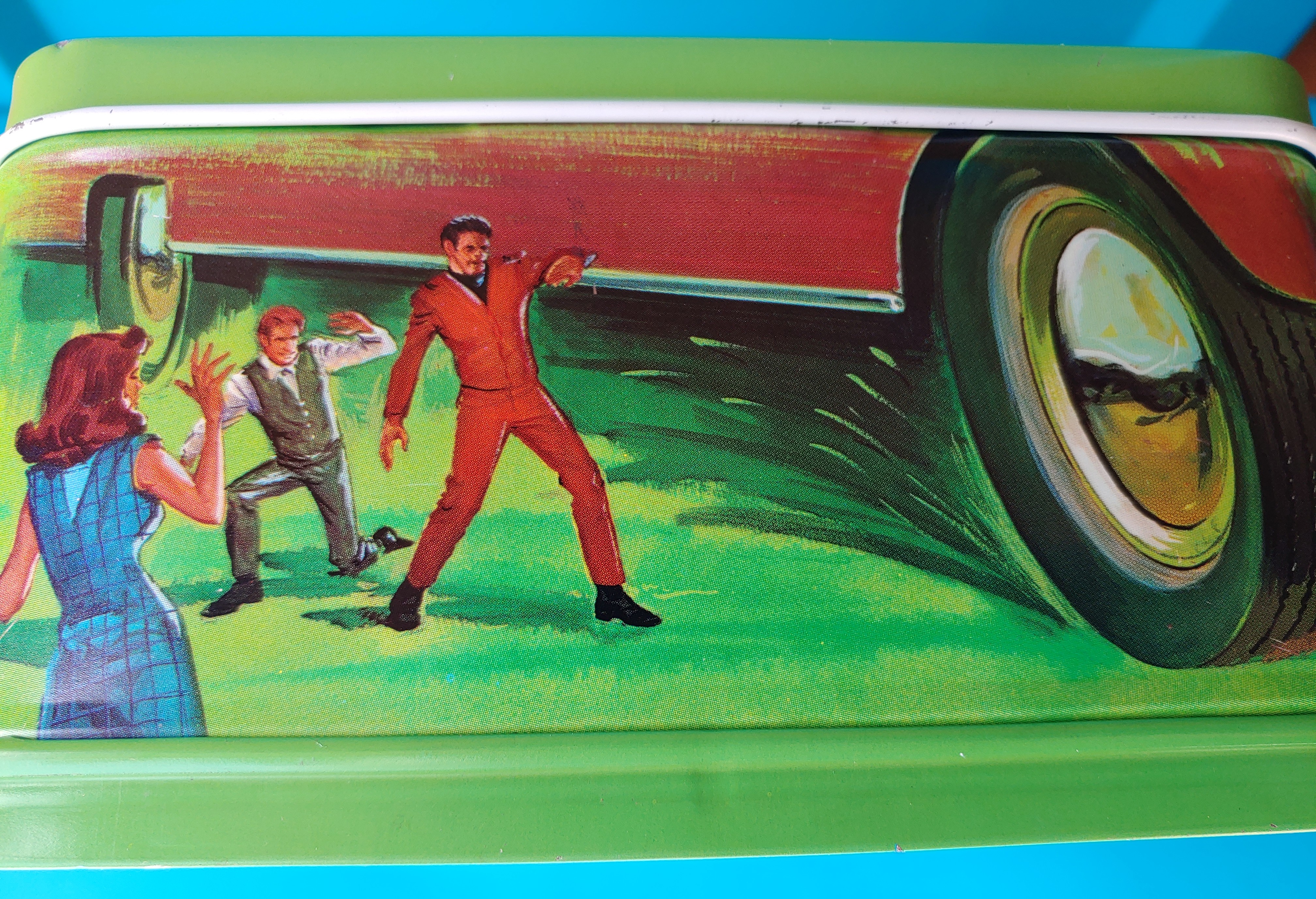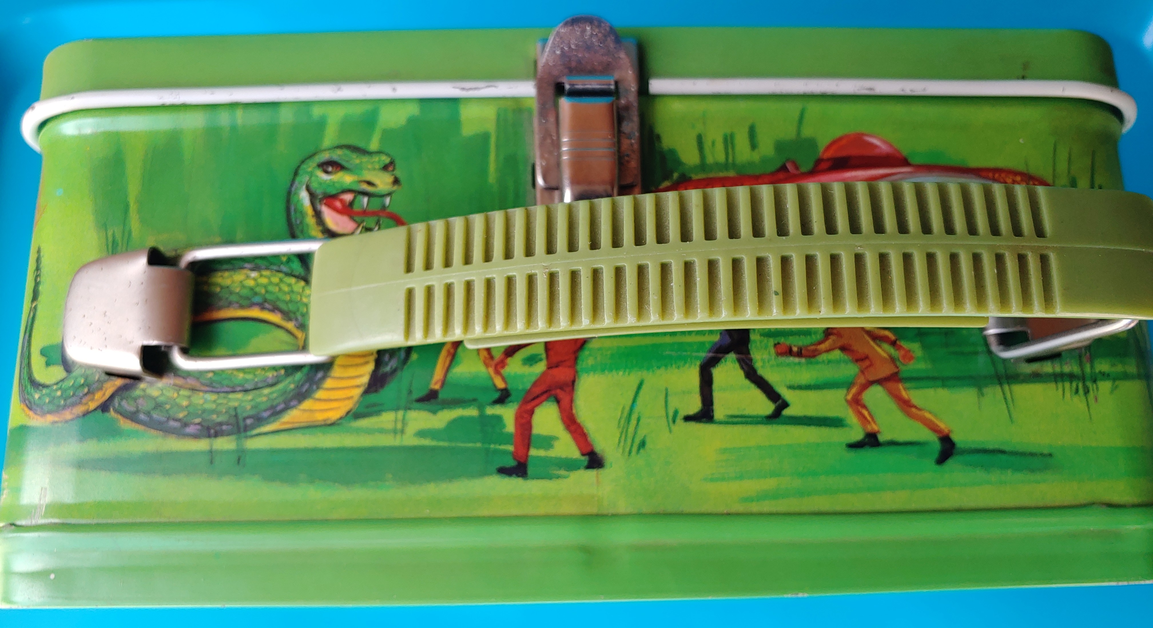 Would you believe the giant on the box is actually Elmer Lehnhardt, the artist of the box? He was the art director at Aladdin in the 60's and 70's, and thought it would be funny to add his self-portrait to this box. He died in 1985.