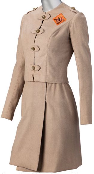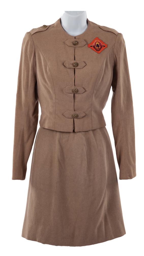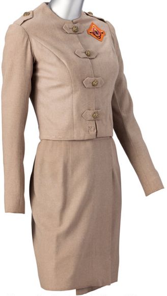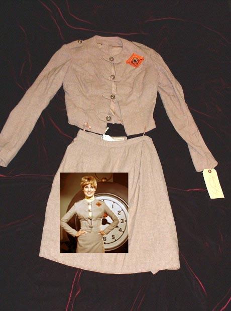 Heather Young "Betty Hamilton" Spindrift Signature Gray Flight Jacket and Skirt from Land of the Giants ( 20th Century Fox TV, 1968-1970 ). Custom-made signature gray wool stewardess uniform comprising a flight jacket and matching skirt worn by Heather Young throughout this beloved Sci-Fi show. The jacket has a multicolor Spindrift logo emblem on the left breast, gold button epaulettes,