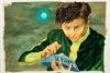 the Land of the Giants in oil paint with varnish, measuring 20" x 30" on 4-ply artist board, glue tipped to a mat measuring 23" x 32" and hinged with transparent mylar overlay. The pre-production artwork depicts the "Spindrift" crew cradled by a menacing child. A second artwork of a giant child gazing through a porthole in oil paint with varnish, indented to 18" x 28", measuring 20" x 30" on 4-ply artist board, glue tipped to a mat measuring 22" x 32" and hinged with transparent mylar overlay. Actual artwork reproduced on page 300 of "The Fantasy Worlds of Irwin Allen" by Jeff Bond, Creature Features 2019.