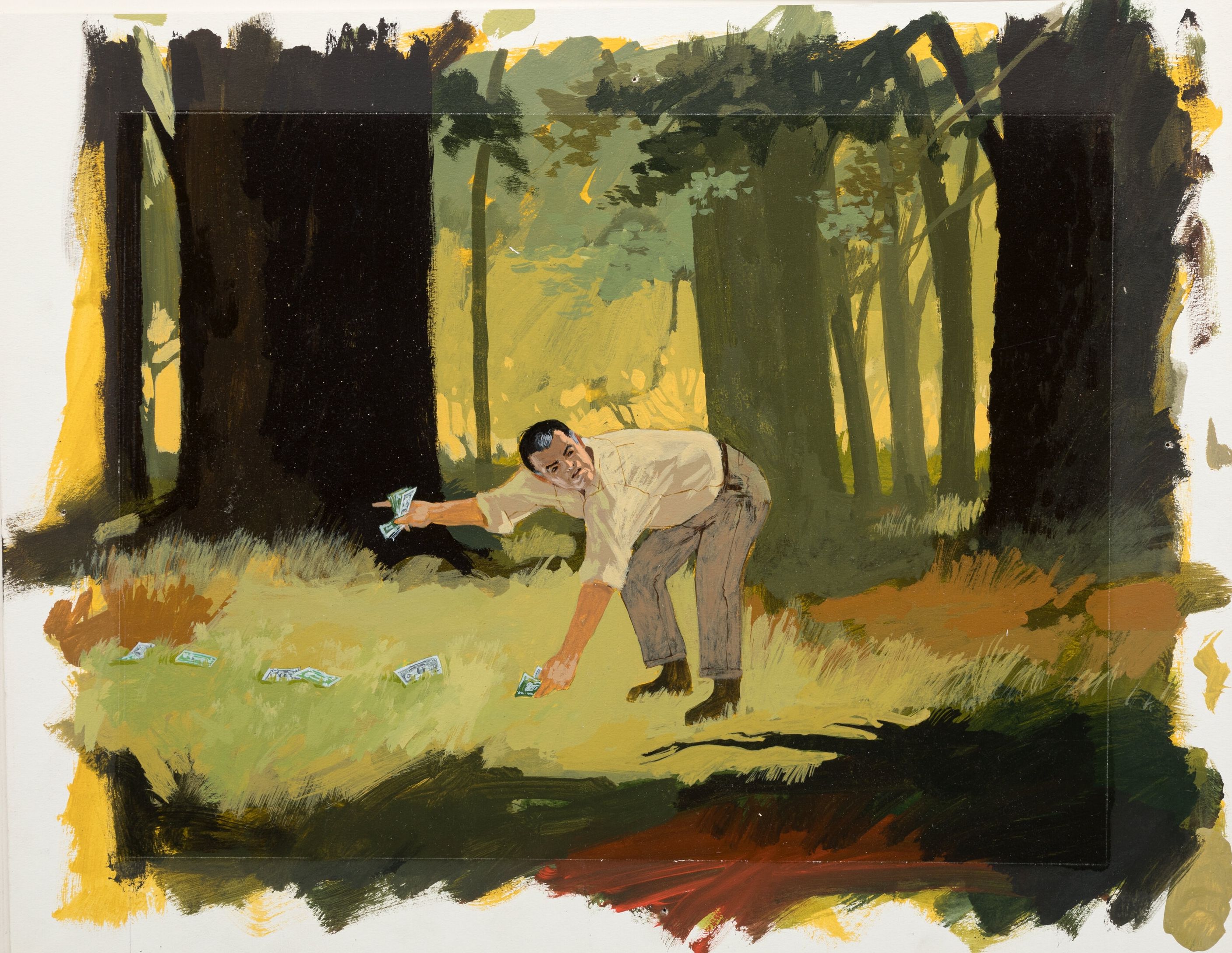 10" x 13" on 4-ply artist board, glue tipped to a mat measuring 17" x 21" and hinged with transparent mylar overlay. A second artwork of oil with varnish measuring 15" x 20" indented to 12" x 16" on 4-ply artist board, glued tipped to a mat measuring 17" x 21" and hinged with transparent mylar overlay depicts Fitzhugh foraging for currency in the woods. A third artwork of Barry Lockridge in oil with varnish measuring 16" x 19" indented with masking to 10" x 13" on 4-ply artist board, glue tipped to a mat measuring 17" x 21" and hinged with transparent mylar overlay. Actual artwork reproduced on pages 298-301 of "The Fantasy Worlds of Irwin Allen" by Jeff Bond, Creature Features 2019.