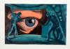 Land of the Giants in tempera and gouache, measuring 19" x 30" on 4-ply artist board, glue tipped to a mat measuring 24" x 35" and hinged with transparent mylar overlay. The pre-production artwork depicts the crew in "Spindrift" being examined by a giant piercing eye. Actual artwork reproduced on page 300 of "The Fantasy Worlds of Irwin Allen" by Jeff Bond, Creature Features 2019.