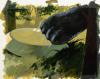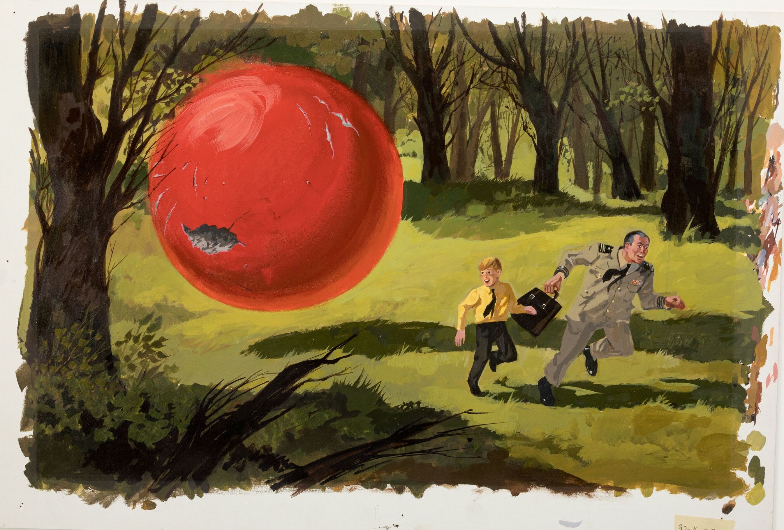 Original Concept Artwork ( 2 ) of a Giant Red Ball and Catspaw Menacing "Spindrift" from Land of the Giants ( Irwin Allen Productions, 1968-1970 ). Vintage original concept art from the Land of the Giants in oil paint with varnish, measuring 20" x 30" indented to 17" x 22" on 4-ply artist board, glue tipped to a mat measuring 23" x 32" and hinged with transparent mylar overlay. The pre-production artwork depicts Alexander Fitzhugh and Barry Lockridge pursued by an enormous rolling red ball. A second artwork depicts an enormous catspaw menacing "Spindrift" in oil paint with light varnish measuring 16" x 20", indented to 12" x 16" on a mat measuring 17" x 21" and hinged with transparent mylar overlay. Actual artwork reproduced on pages 298-301 of "The Fantasy Worlds of Irwin Allen" by Jeff Bond, Creature Features 2019.
