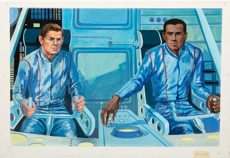 ( Irwin Allen Productions, 1968-1970 ). Vintage original concept art from The Land of the Giants of the pilots in the cockpit of "Spindrift" navigating space, in oil paint, tempera, and graphite with varnish, indented with masking to 17" x 26", measuring