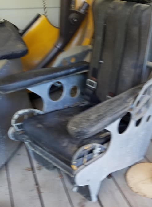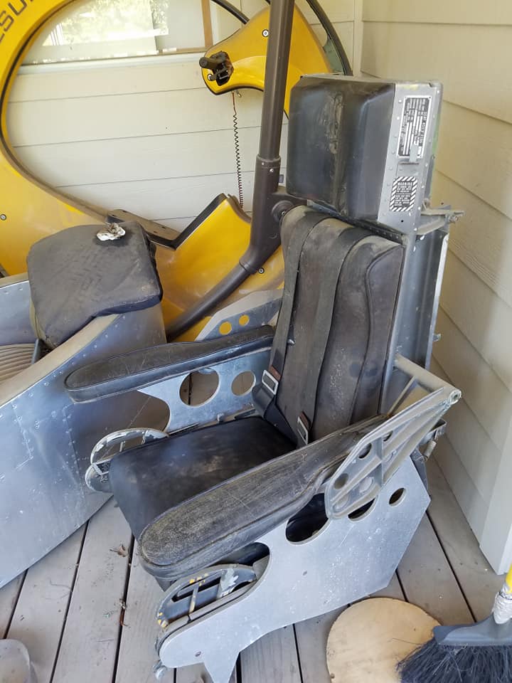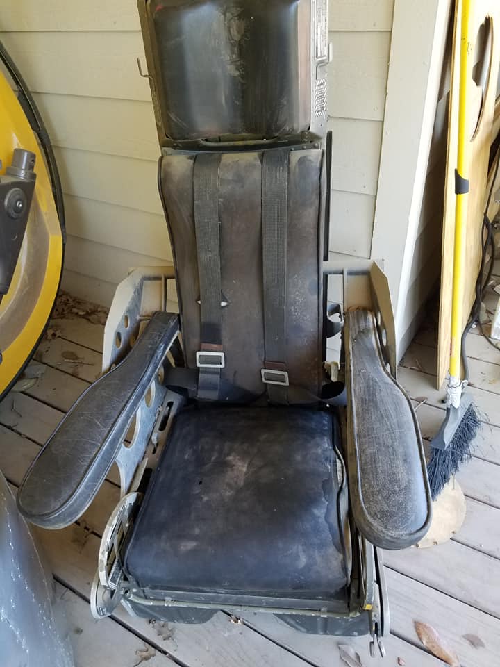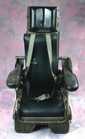 seat from a U.S. Air Force fighter, which has been modified with custom aluminum side accents and black leather upholstered arm