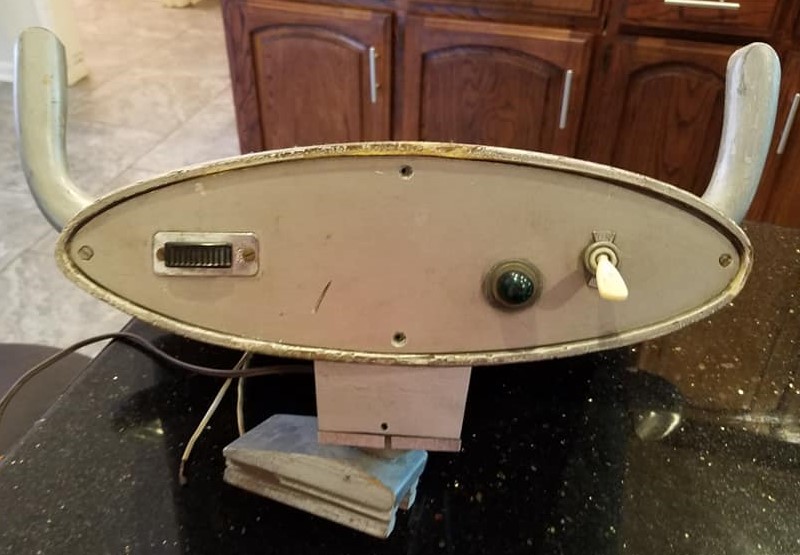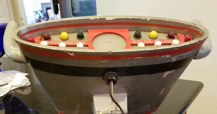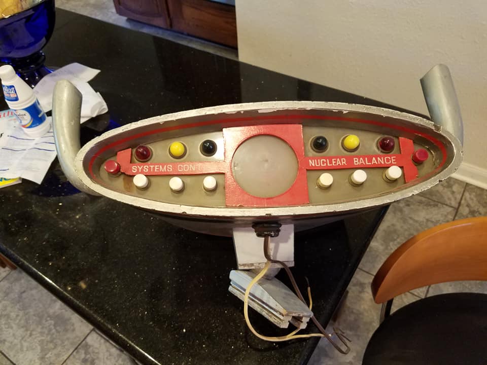 The original Spindrift control yoke from Land of the Giants. ( ABC-TV, 1968-70 ) This scratch-built prop is fabricated in wood, plastic and crude 1960's era electronics ( Which once illuminated the faceplate ). Hand-set lettering on the faceplate reads "Systems Control - Nuclear Balance". The central control yoke of the Spindrift Supersonic Transport Vehicle, this prop is seen prominently in the series. Comes with the original hand drawn schematic designs for the yoke.