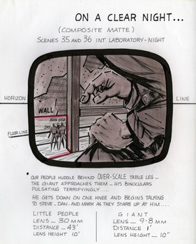 Color storyboard with effects breakdown notation for Land of the Giants ( ABC-TV, 1968-70 ) Irwin Allen's Land of the Giants TV series posed a visual effects challenge for every episode. This elaborate storyboard shows how elements of the miniature heroes would be photographed using one setup, then combined with another of the giants to create the absurdities of scale that were the show's stock in trade. Measures 8 1/2 in. x 11 in.