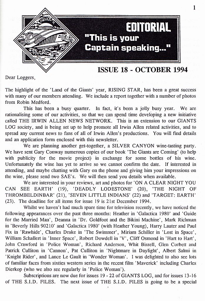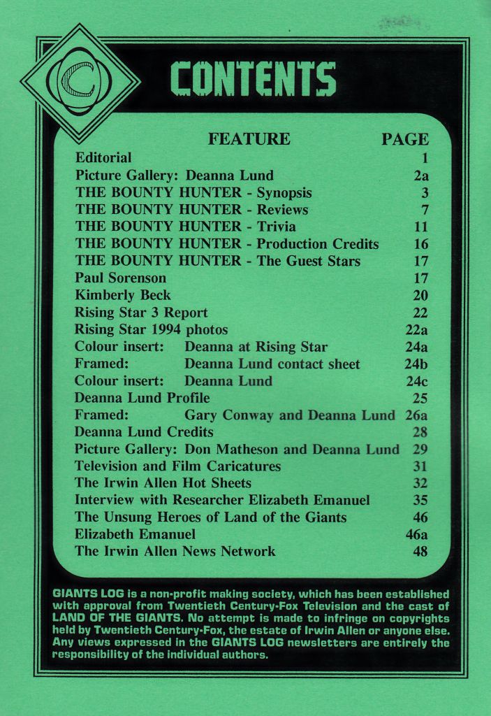 Land of the Giants Fanzine Log magazine issue #18 Autumn 1994. Features, The Bounty Hunter reviews, and Rising Star with Deanna Lund.Value: $20.