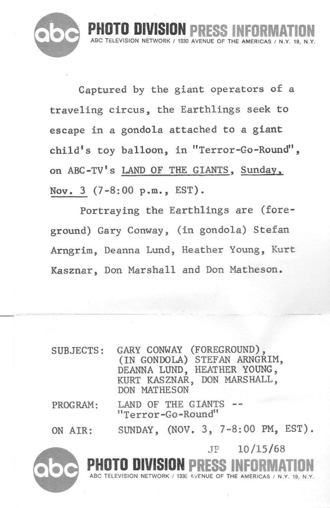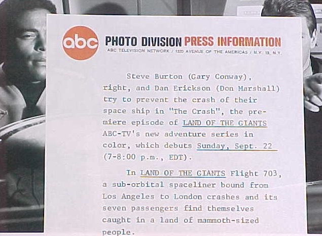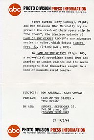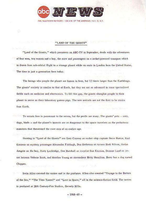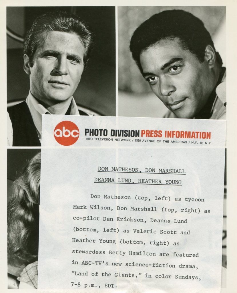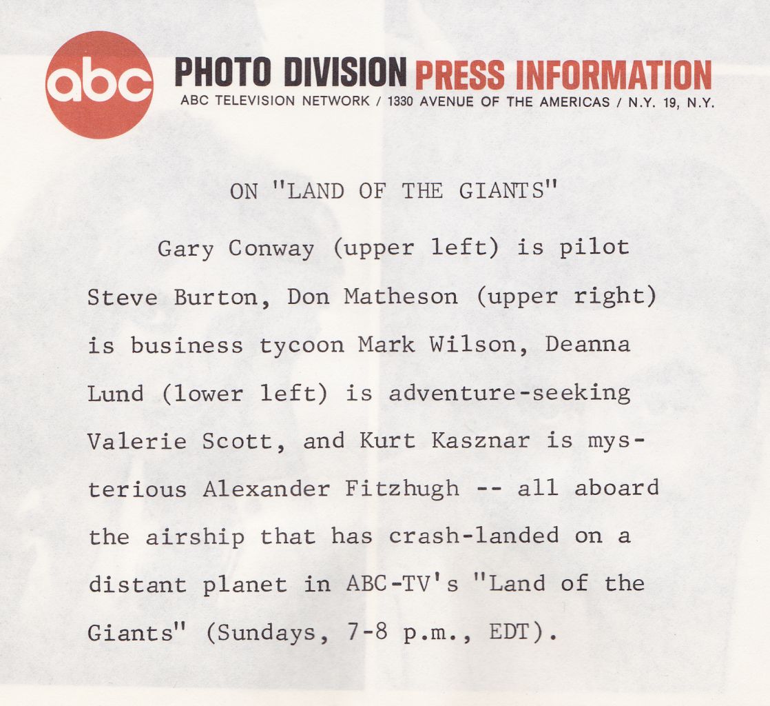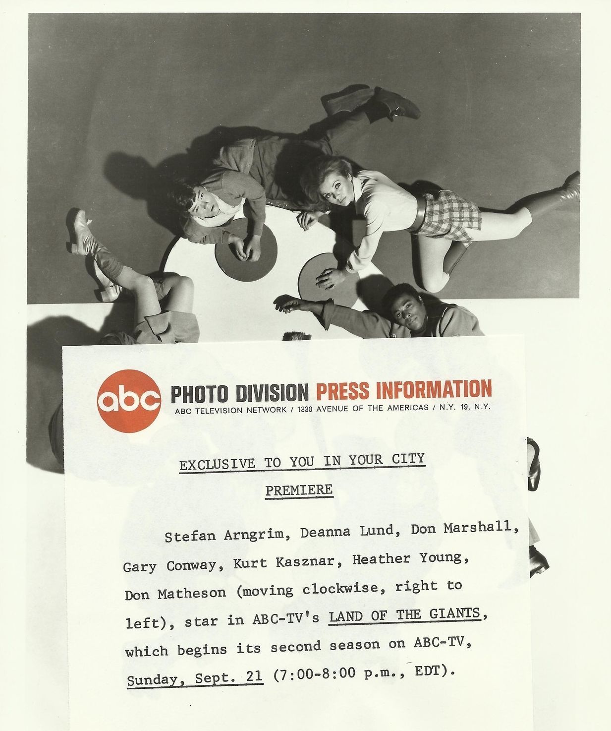Land of The Giants ABC 20th Century Fox TV Network Press Material issued 1968. These original studio press material features four black and white original press photos, six pages of press information regarding the show's concept, fact sheets, biographies of the cast ( Gary Conway, Kurt Kasznar, Don Matheson, Stefan Arngrim, Don Marshall, Deanna Lund, and Heather Young ), behind the scenes production information, and background on producer Irwin Allen.
