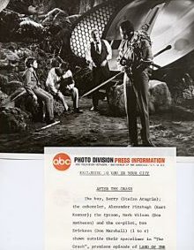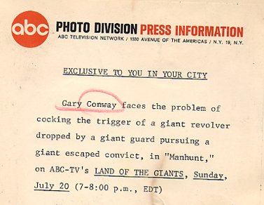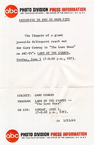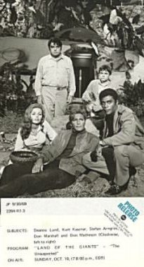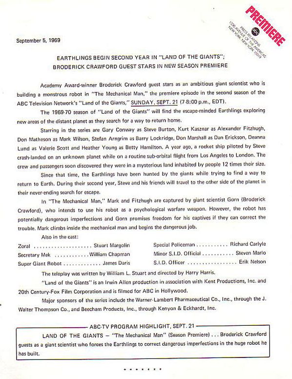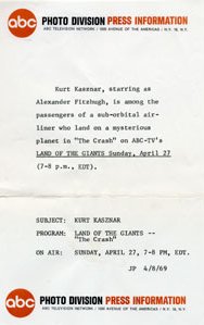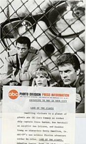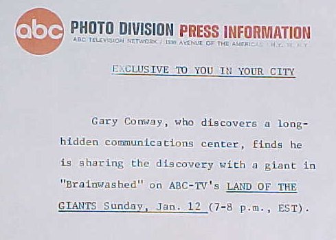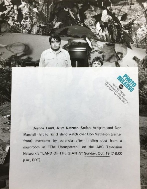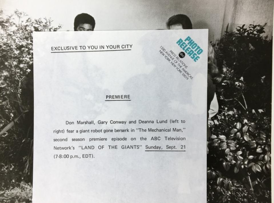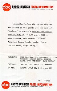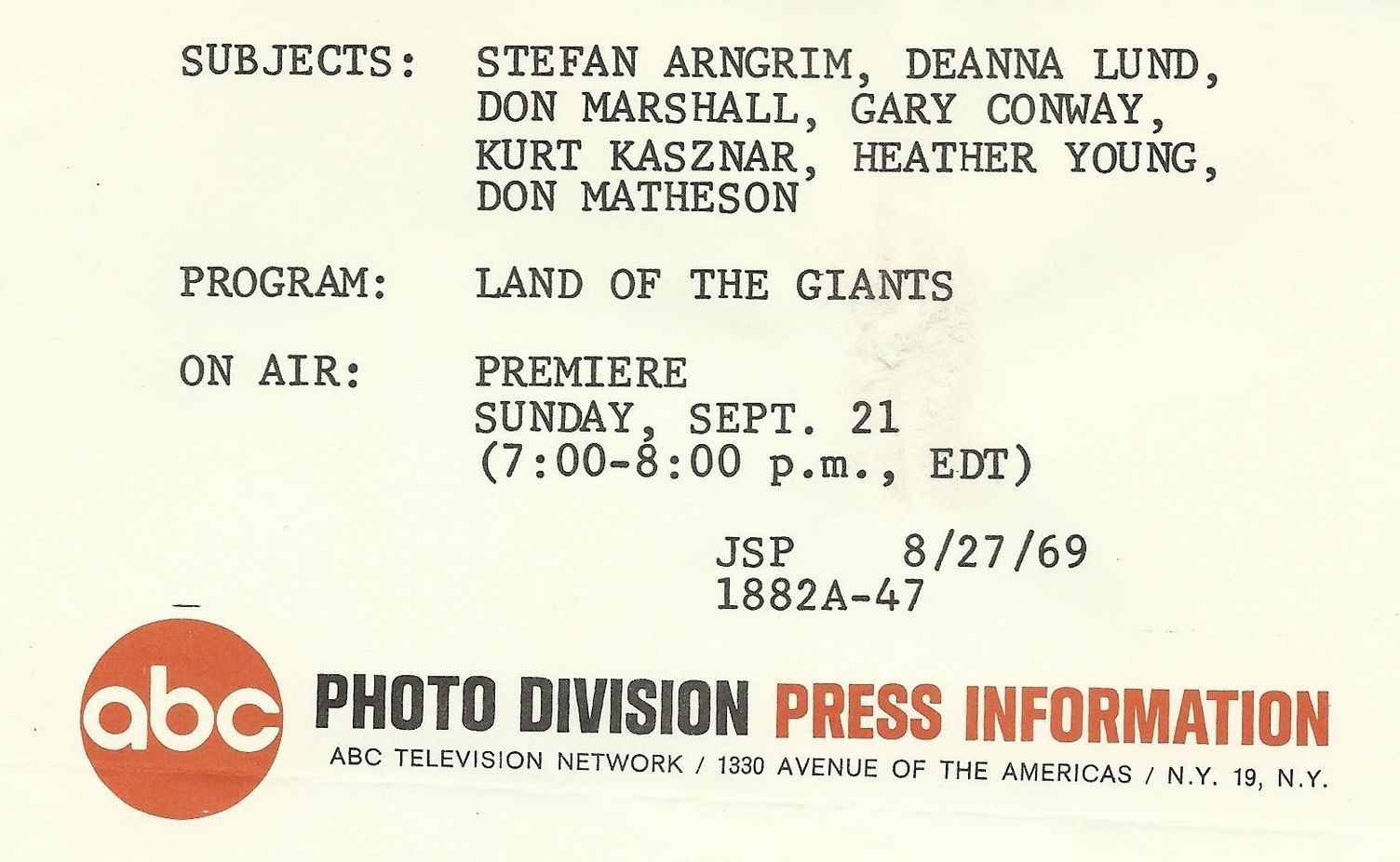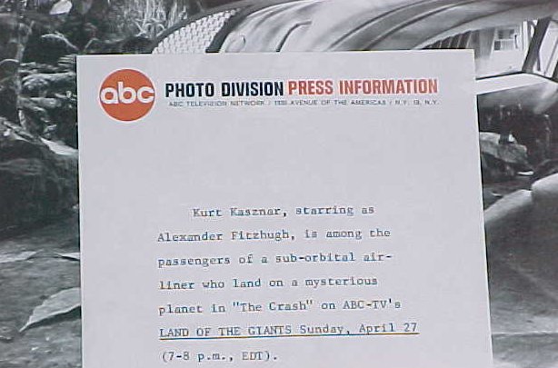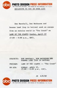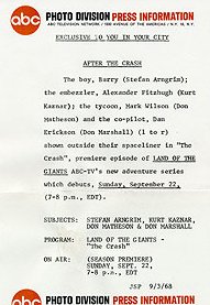 Land of The Giants ABC 20th Century Fox TV Network Press Material issued 1968. These original studio press material features four black and white original press photos, six pages of press information regarding the show's concept, fact sheets, biographies of the cast ( Gary Conway, Kurt Kasznar, Don Matheson, Stefan Arngrim, Don Marshall, Deanna Lund, and Heather Young ), behind the scenes production information, and background on producer Irwin Allen.