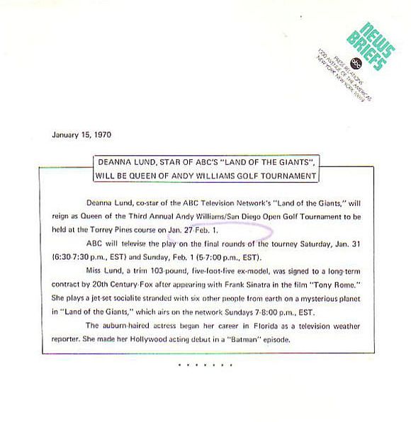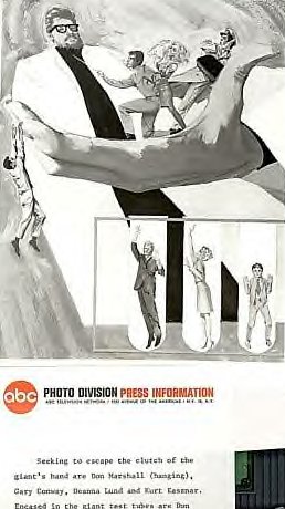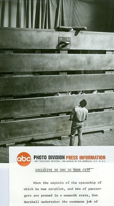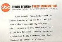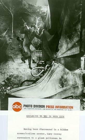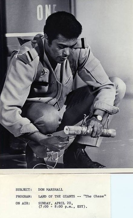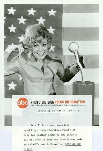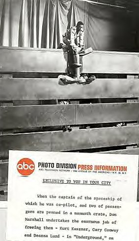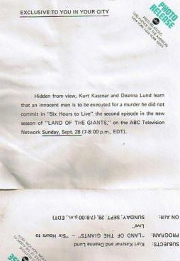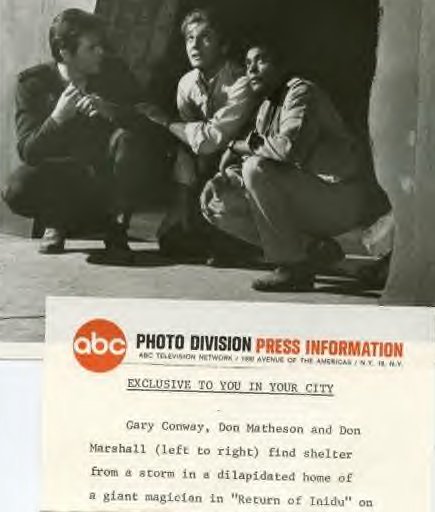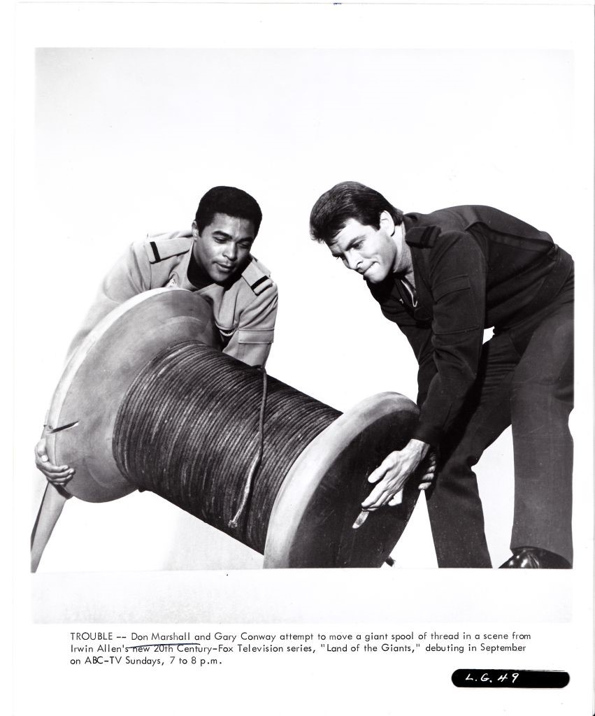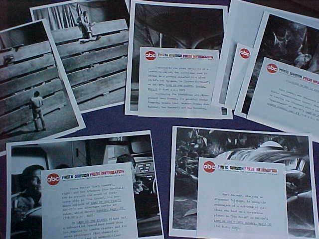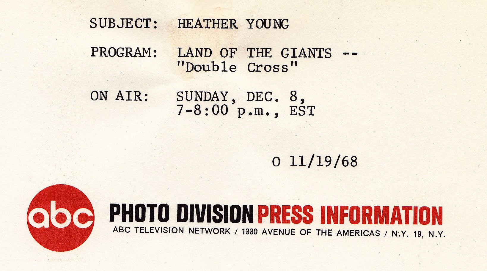 Land of The Giants ABC 20th Century Fox TV Network Press Material issued 1968. These original studio press material features four black and white original press photos, six pages of press information regarding the show's concept, fact sheets, biographies of the cast ( Gary Conway, Kurt Kasznar, Don Matheson, Stefan Arngrim, Don Marshall, Deanna Lund, and Heather Young ), behind the scenes production information, and background on producer Irwin Allen.
