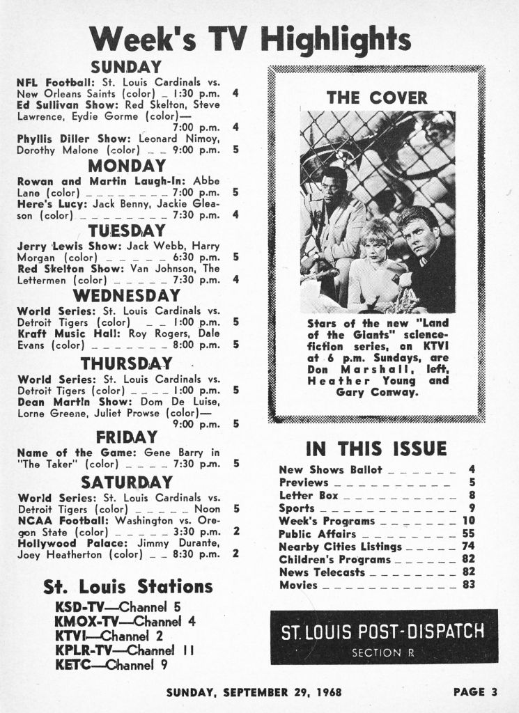 Here is a 1968 TV Magazine issued by the St. Louis Dispatch. These guides were normally free in the Sunday papers. The cover features, Don Marshall, Heather Young, Gary Conway, and the Giant in the foreground. TV Guides are quite collectible, and prices for favorite TV shows are highly paid for by fans, and or collectors.