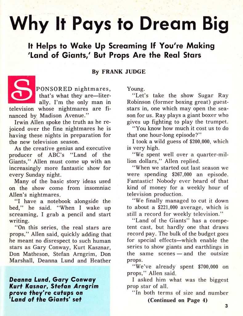 From the TV series Land of the Giants featuring the cover of Deanna Lund, and Gary Conway. This TV Magazine was issued by the Sunday Herald Traveler dated July 27-August 2, 1969. These guide came free through the local Sunday newspapers.Value: $200.