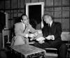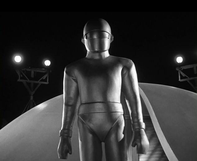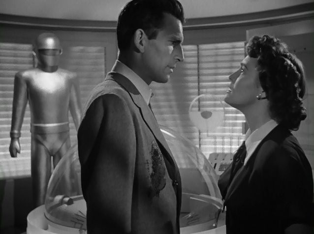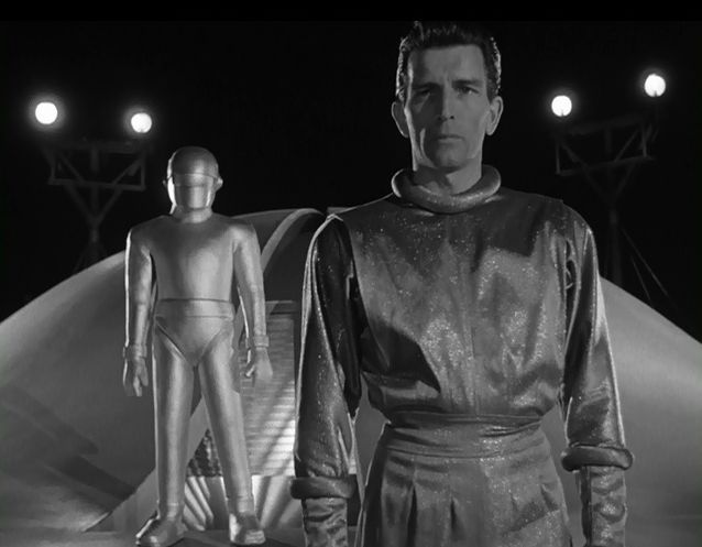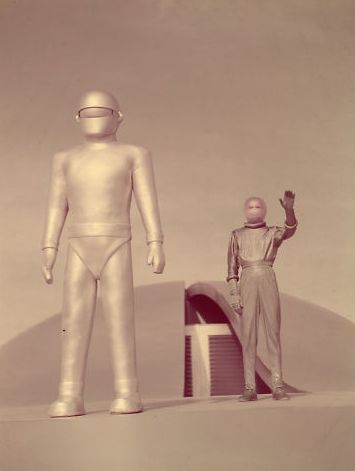I am leaving soon, and you will forgive me if I speak bluntly. The universe grows smaller every day, and the threat of aggression by any group, anywhere, can no longer be tolerated. There must be security for all or no one is secure. Now, this does not mean giving up any freedom except the freedom to act irresponsibly. Your ancestors knew this when they made laws to govern themselves and hired policemen to enforce them. We of the other planets have long accepted this principle. We have an organization for the mutual protection of all planets and for the complete elimination of aggression. The test of any such higher authority is, of course, the police force that supports it. For our policemen, we created a race of robots. Their function is to patrol the planets in space ships like this one and preserve the peace. In matters of aggression, we have given them absolute power over us; this power can not be revoked. At the first sign of violence, they act automatically against the aggressor. The penalty for provoking their action is too terrible to risk. The result is that we live in peace, without arms or armies, secure in the knowledge that we are free from aggression and war free to pursue more profitable enterprises. Now, we do not pretend to have achieved perfection, but we do have a system, and it works. I came here to give you these facts. It is no concern of ours how you run your own planet. But if you threaten to extend your violence, this Earth of yours will be reduced to a burned-out cinder. Your choice is simple: Join us and live in peace, or pursue your present course and face obliteration. We shall be waiting for your answer; the decision rests with you.