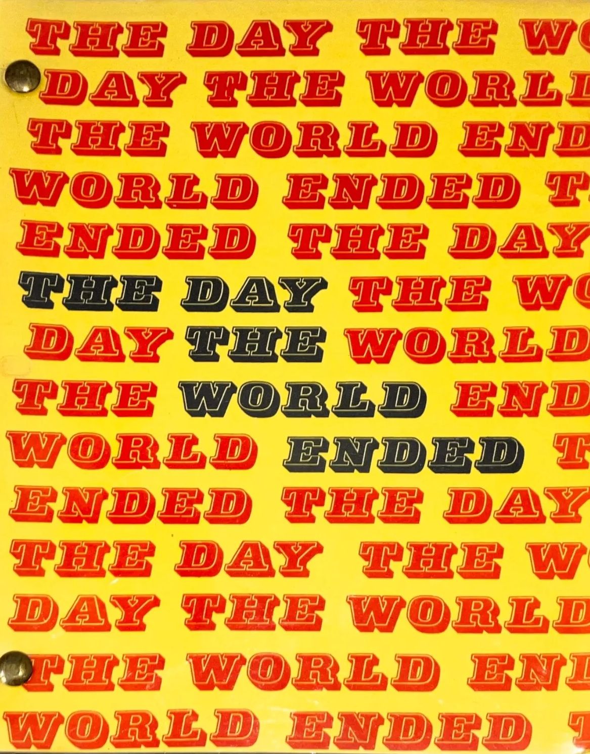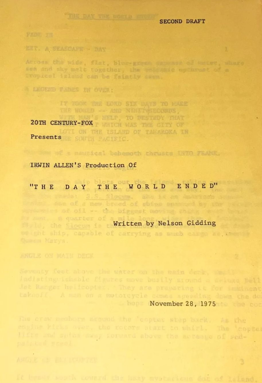 Irwin Allen's original production script revised 3-20-79 on the 1980 movie, "The Day the World Ended". As always with an all-star cast such as., Paul Newman, Jacqueline Bisset, William Holden, James Franciscus, Eddie Albert, Shelia Allen, Ernest Borgnine, Red Buttons, Barbara Carrera, and Valentina Cortessa.