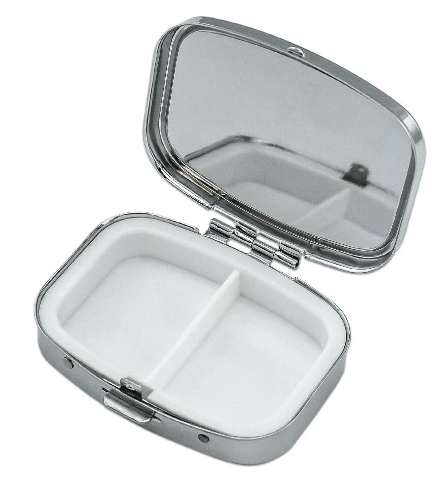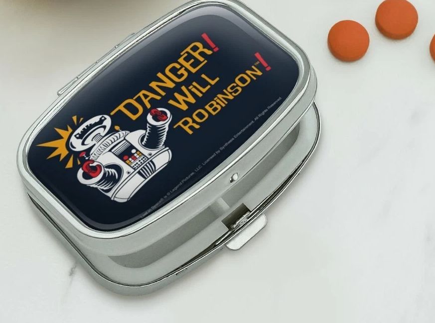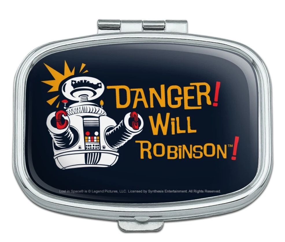 The interior features a plastic insert, which gives you two compartments with which to organize your pill box's contents. The exterior of the case is made of chrome-plated metal, and is approximately 2.2" ( 5.6cm ) x 1.6" ( 4.1cm ) x 0.7"( 1.8cm ) in size. Lost in Space is Legend Pictures, LLC. Licensed by Synthesis Entertainment. All Rights Reserved. A Graphics and more product.