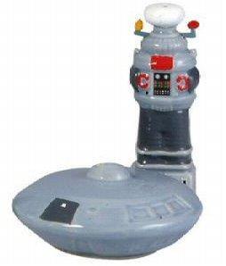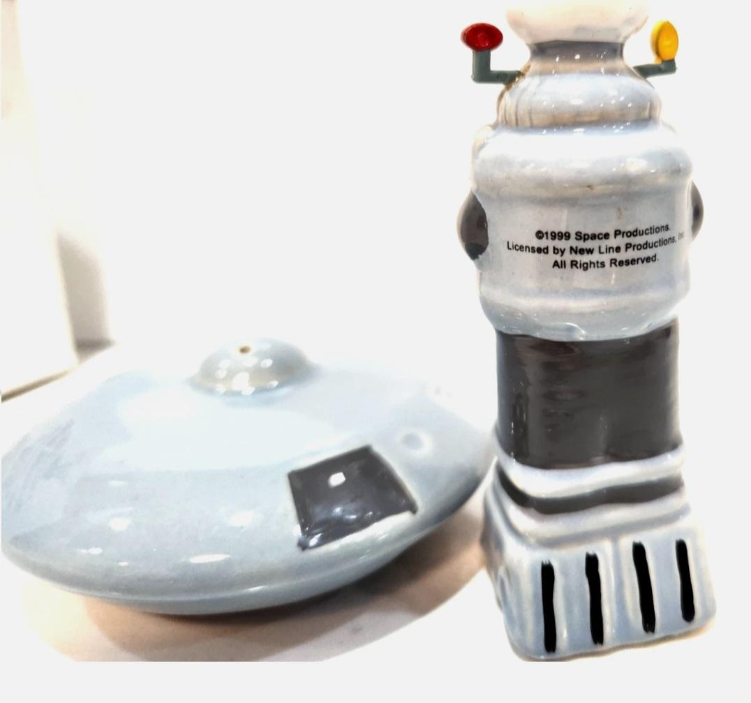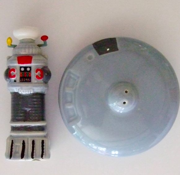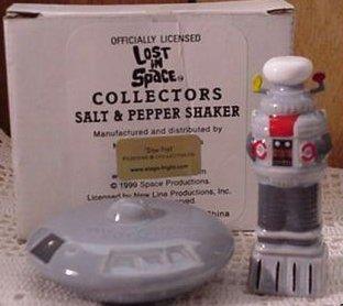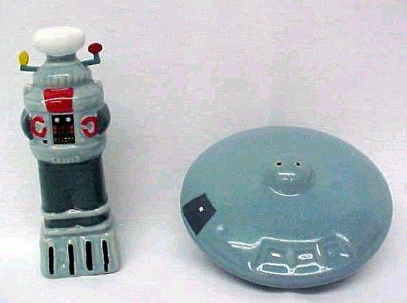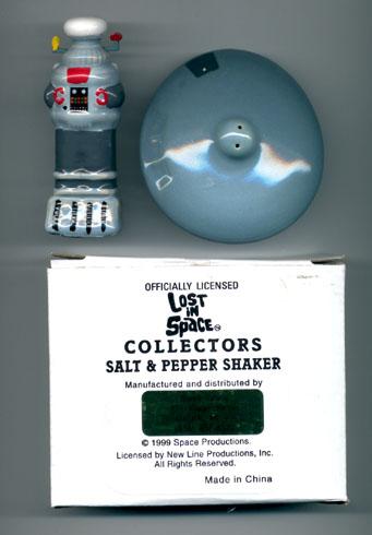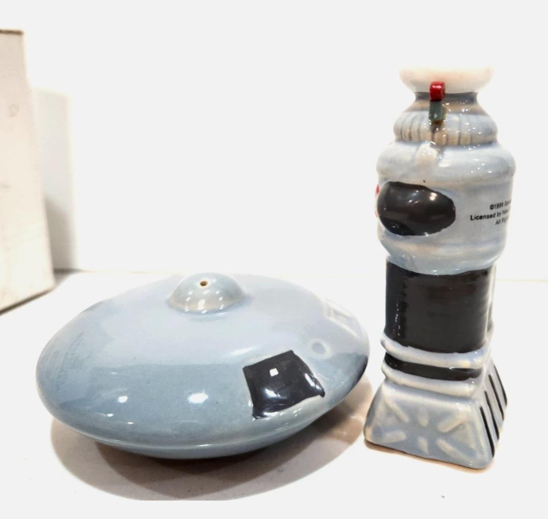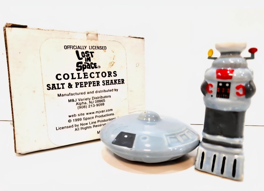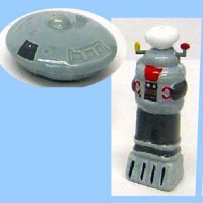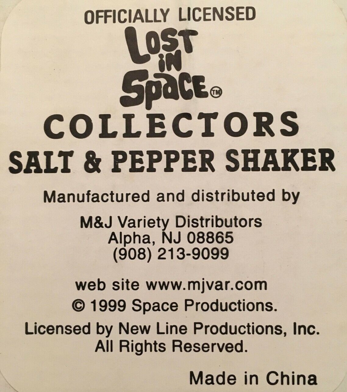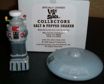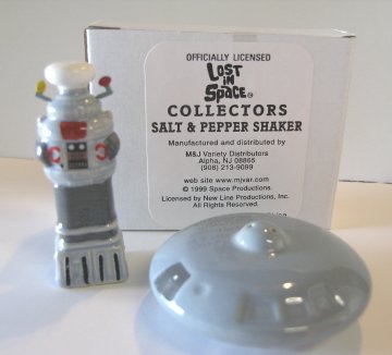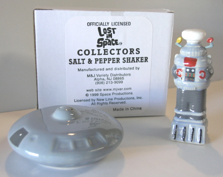 This cute Lost in Space salt & pepper set was only available through M & J Variety in New Jersey in 1997-98. The set consist of adorable ceramic shakers of the B-9 Robot & the Jupiter-2, with small holes in the top for dispensing the spices. They also have