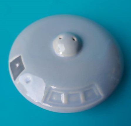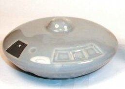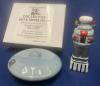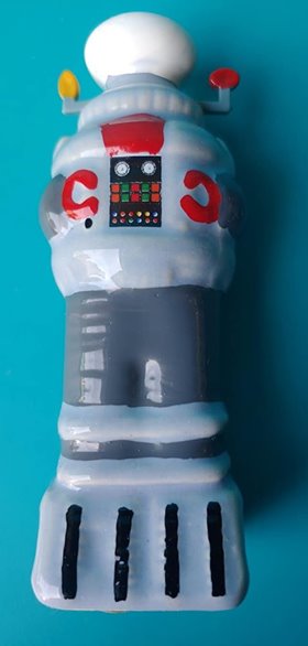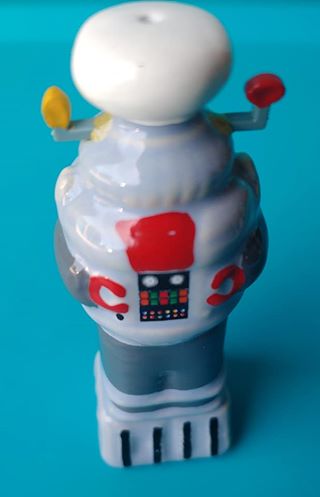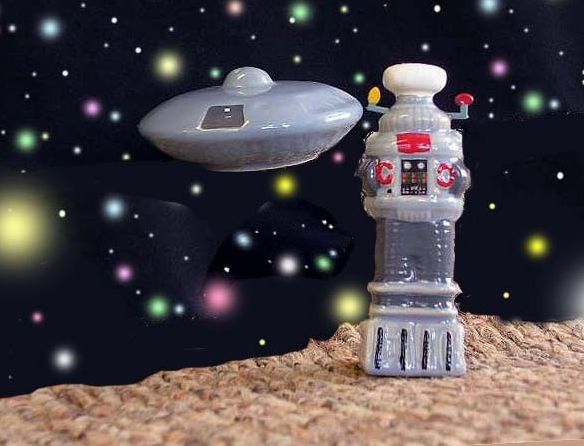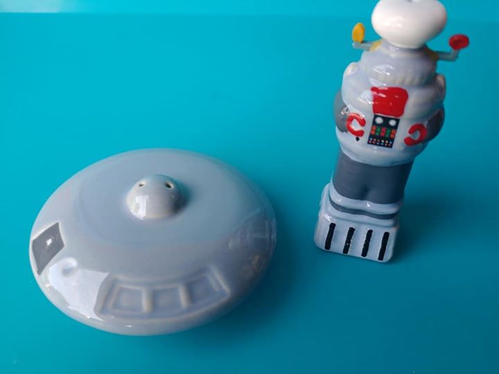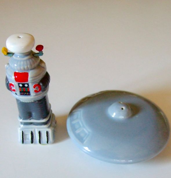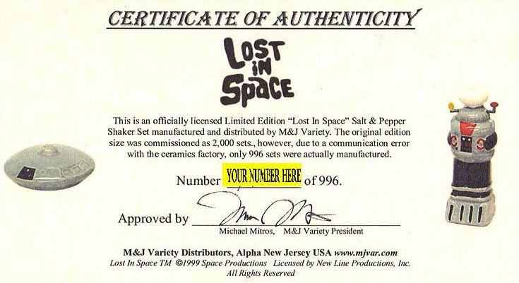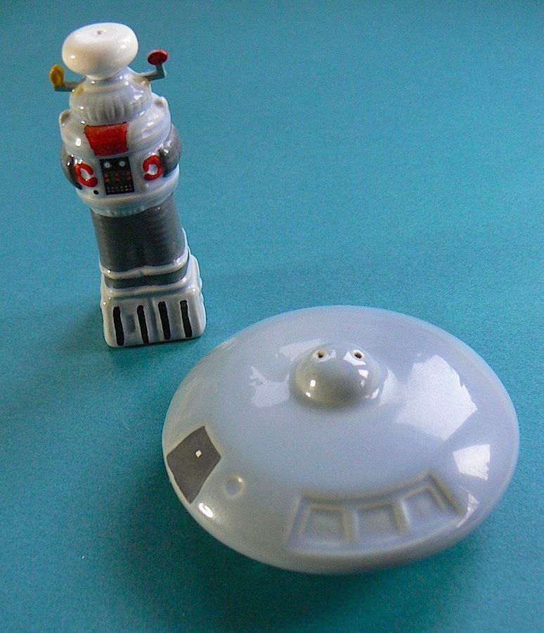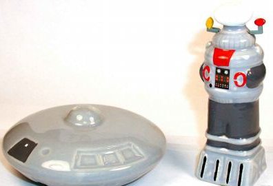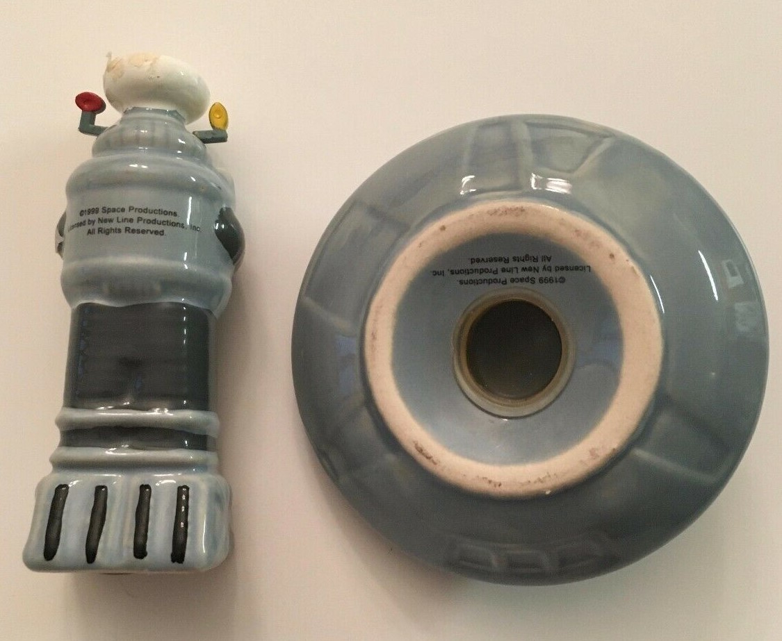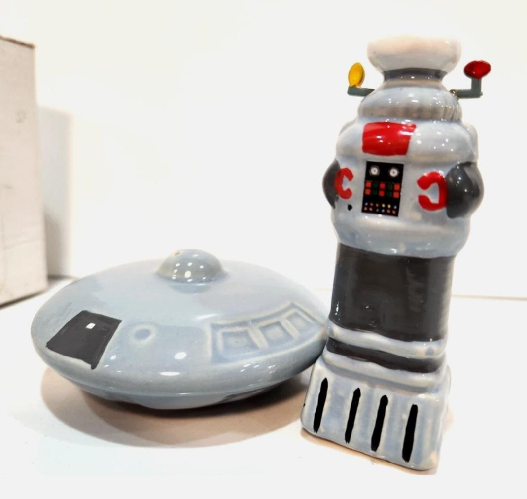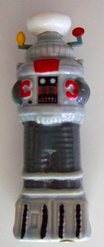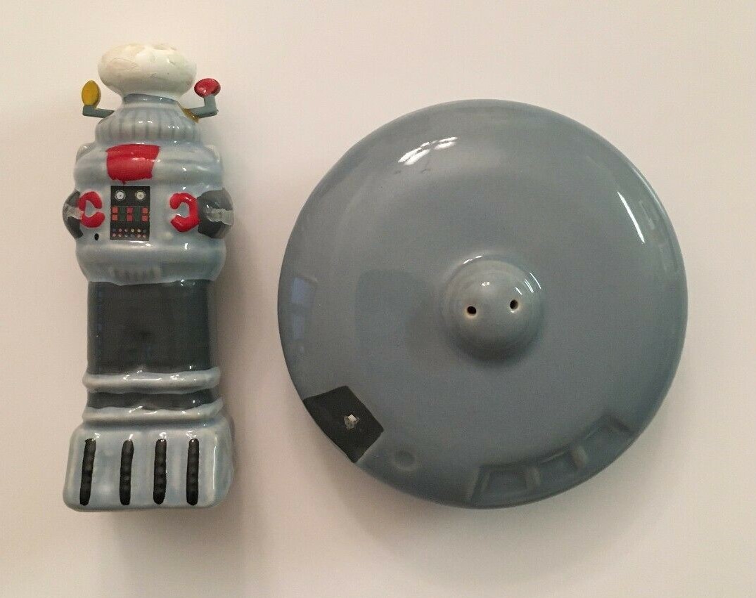 This cute Lost in Space salt & pepper set was only available through M & J Variety in New Jersey in 1997-98. The set consist of adorable ceramic shakers of the B-9 Robot & the Jupiter-2, with small holes in the top for dispensing the spices. They also have
