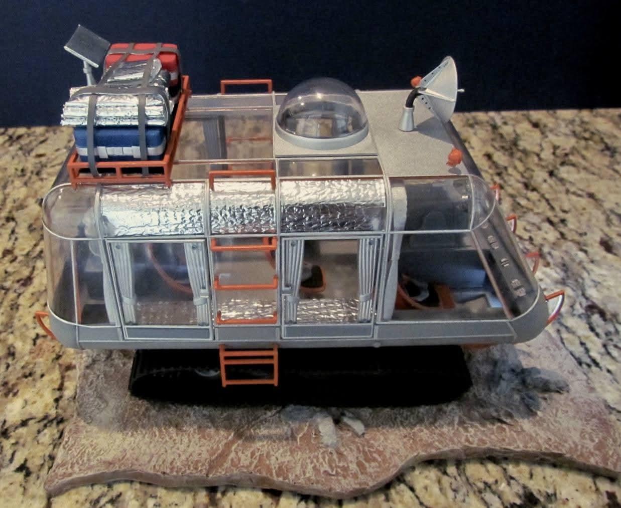 Model includes LED in headlights, fiber optics in dashboard instrument panels and radar scope, added headlight bezels, Lunar Models resin Robinson Family figures. Canopy sun shield, scratch built equipment cases, solar blankets and luggage straps. The diorama