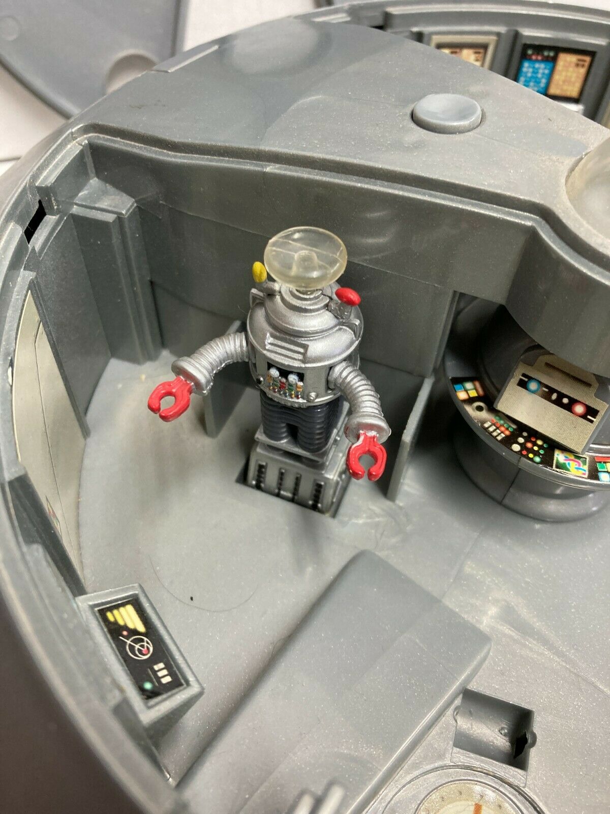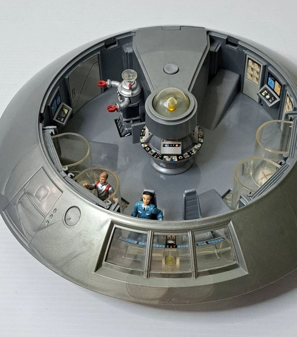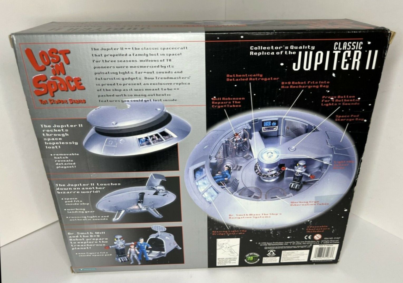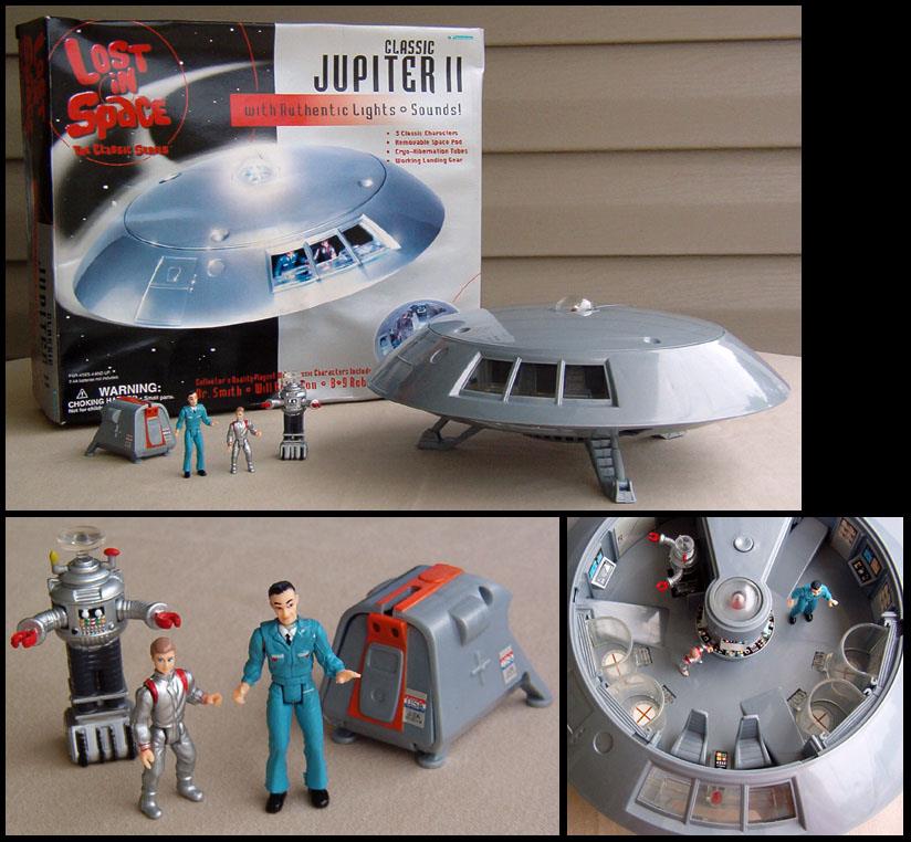 Lost on Space Jupiter-2 Trendmasters. We have what many think is the best Lost in Space toy ever produced. The Jupiter-2 playset includes an 11" plastic Jupiter-2. The ship features lights on the top and bottom sensor arrays, and a light in the cockpit. There are 3 separate sound effects that play when the lights are activated. The landing gear can be raised or lowered for flight or landing display. If you open the top, inside is a detailed interior, with a very good rendition of the ships details, although it is very simple compared to the TV shows set. In addition, they have included an undersized Space Pod, that has a small storage area on the Jupiter-2 you can place it in. The Space Pod can accommodate one of the three crew figures included with the set. And yes, it does include a small B9 robot, as well as Dr. Smith and Will Robinson. A very nice set, with lots of play possibilities, as well as being highly collectable.