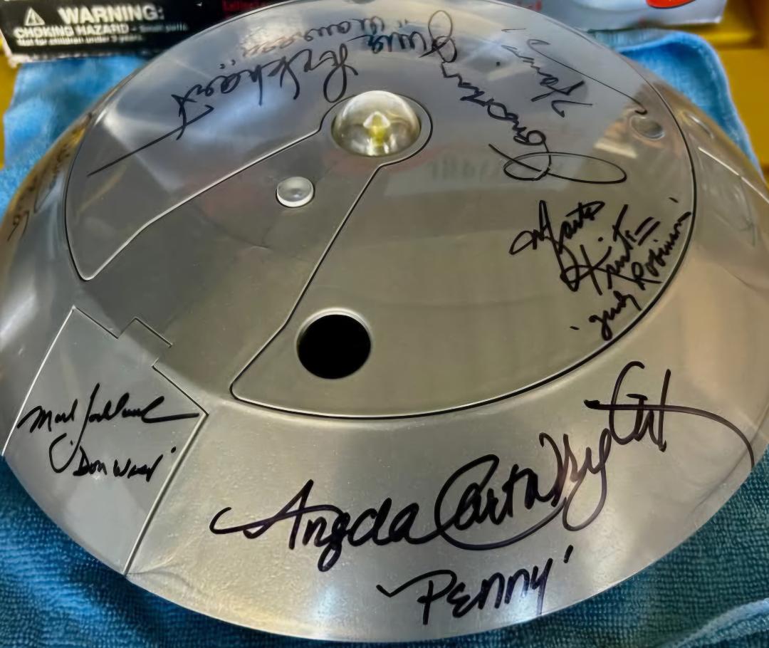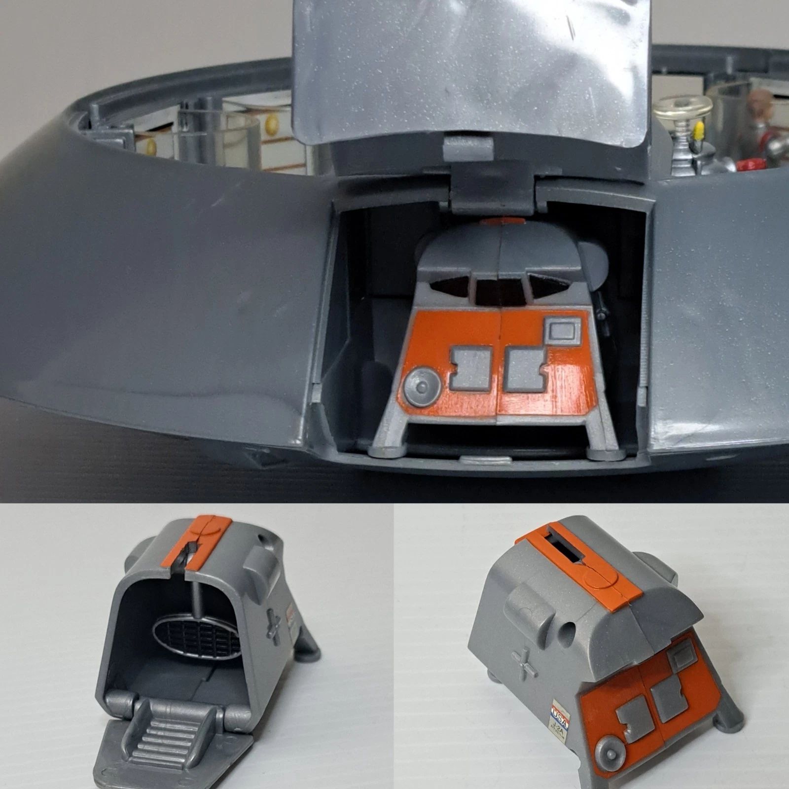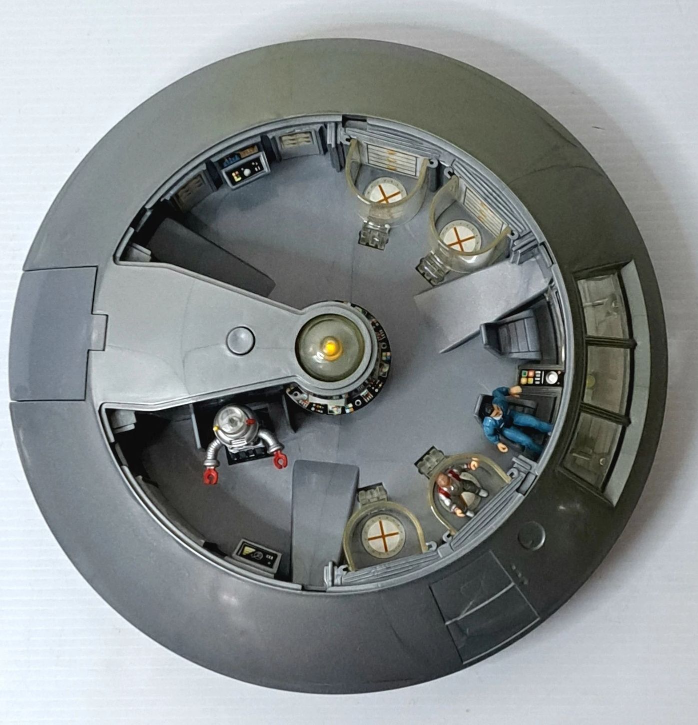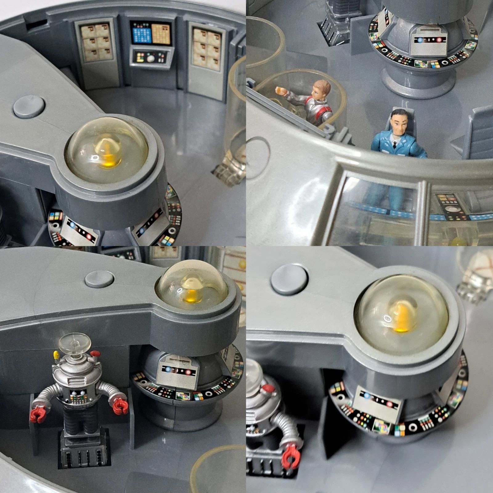 Lost on Space Jupiter-2 Trendmasters. We have what many think is the best Lost in Space toy ever produced. The Jupiter-2 playset includes an 11" plastic Jupiter-2. The ship features lights on the top and bottom sensor arrays, and a light in the cockpit. There are 3 separate sound effects that play when the lights are activated. The landing gear can be raised or lowered for flight or landing display. If you open the top, inside is a detailed interior, with a very good rendition of the ships details, although it is very simple compared to the TV shows set. In addition, they have included an undersized Space Pod, that has a small storage area on the Jupiter-2 you can place it in. The Space Pod can accommodate one of the three crew figures included with the set. And yes, it does include a small B9 robot, as well as Dr. Smith and Will Robinson. A very nice set, with lots of play possibilities, as well as being highly collectable.