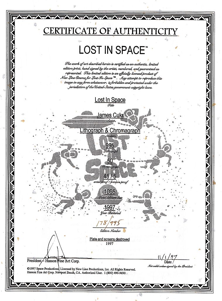 This beautiful litho was released in conjunction with the original "Lost in Space" TV series. Light Speed Fine Arts in Laguana Hills Calif. sold this litho in 1998. The Company attempted to obtain signatures from the actors for this litho. Sadly do the actors schedules this was not possible. One of the nicest collectibles on the LIS movie to add to your collection.