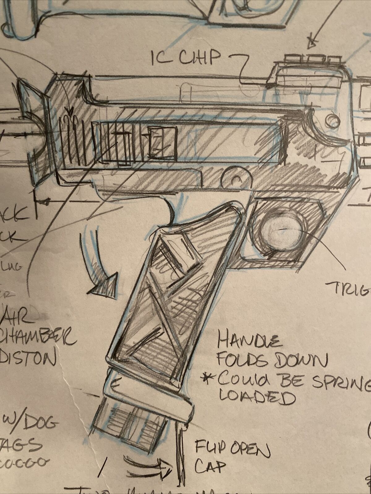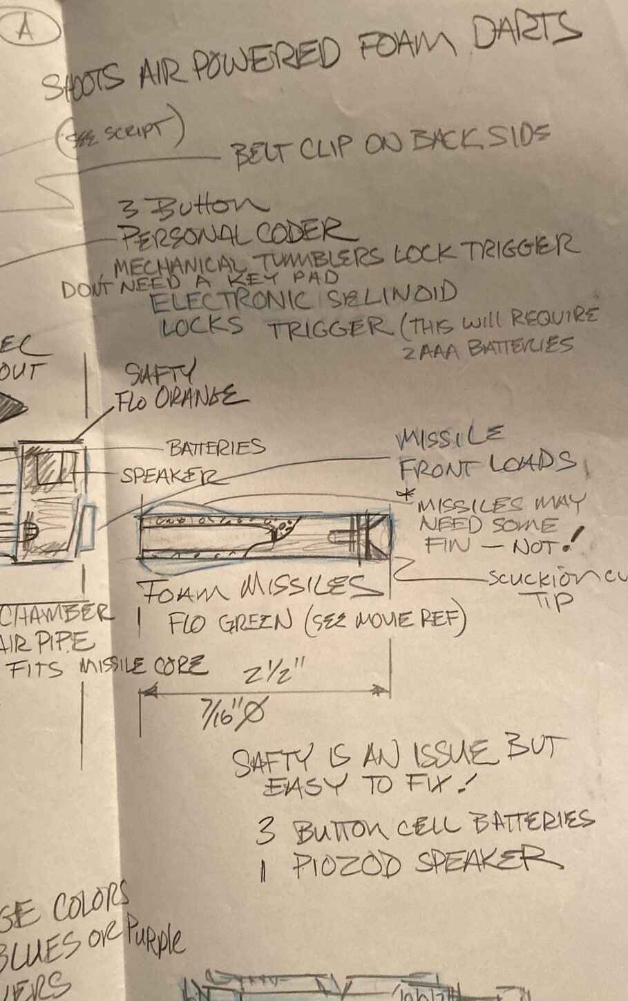 Early stage original prototype concept drawing artwork for the 1998 Trendmasters space blaster toy gun. Artwork was obtained from an x-employee that worked on this toy project. Incredible detail on this great toy!