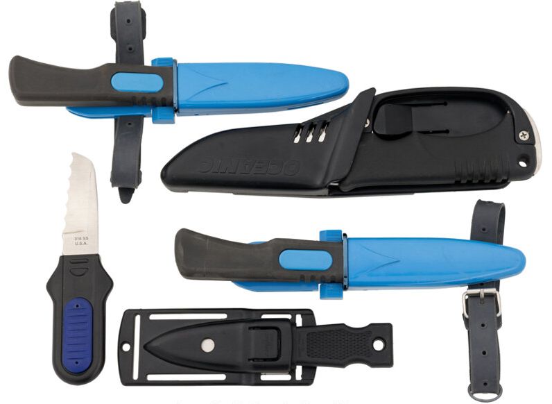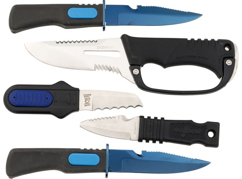 Lost in Space ( New Line, 1998 ), Group of ( 5 ) Real Diving Knives. Original stainless steel diving knives including ( 1 ) "Oceanic" brand 5" blade with black plastic sheath, ( 2 ) 4.75" blue blades with blue plastic sheaths on rubber belts, ( 1 ) "SeaQuest" brand 2.5" blade with black plastic sheath, and ( 1 ) 3" blade without sheath. The knives exhibit production wear and the 2.5" blade's tip has broken off. Obtained from New Line Cinema. Comes with a COA from Heritage Auctions.