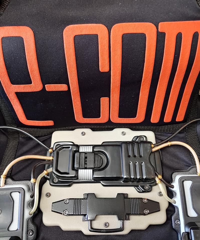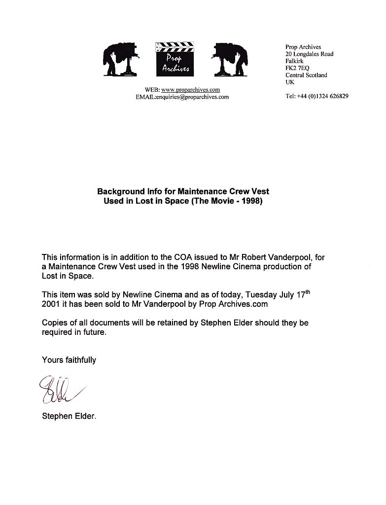 This Hollywood prop costume was up for bid on eBay on July 2, 2001. I have 2 original space costumes of William Hurt, and the jumpsuit worn by Lacey Chabert. As well as the original blaster gun, and drawings. This wardrobe item was worn in the "Lost in Space" movie in 1998. The "E-COM" vest was worn by the maintenance crew during scenes, when the Jupiter-2 is still on earth. This vest is seen very clearly onscreen as you can see from the pictures shown.