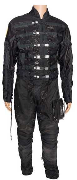Gary Oldman "Dr. Zachary Smith" Proteus stunt ensemble from Lost in Space. ( New Line, 1998 ) Original ( 2 ) piece ensemble including ( 1 ) black and gray polyblend jacket with standing collar, panels of black mesh over plastic liner, gray nylon panels, gray web ribbon piping and embellishment, numerous small black plastic rectangular vents, corset lacing under arms and on sides, resin "a.s.o.m.a.c." badge on right arm, metal "Jupiter Two" badge left chest, zipper hem for attaching to pants, interior lined in black quilted fabric, with zipper and ratchet buckle front closure, and ( 1 ) pair matching pants with integral black nylon chaps, reinforced padded knees, vinyl utility pouches on left leg, corset lacing at ankles, waist zipper for attaching to jacket, with hidden zipper, Velcro and snap front closure, retaining internal bias labels handwritten, "Smith Stunt Double" and "Gary Stunt". Exhibiting production wear with studio distressing and soiling. In very good to fine condition.