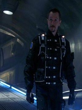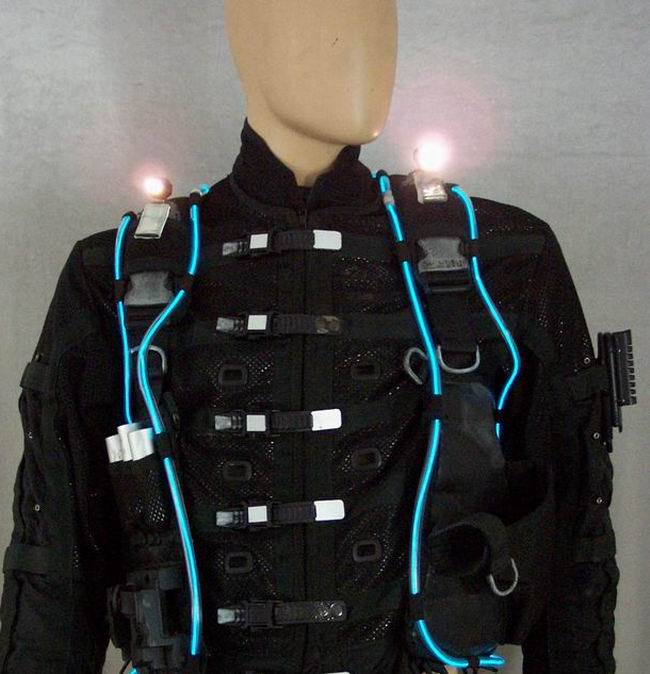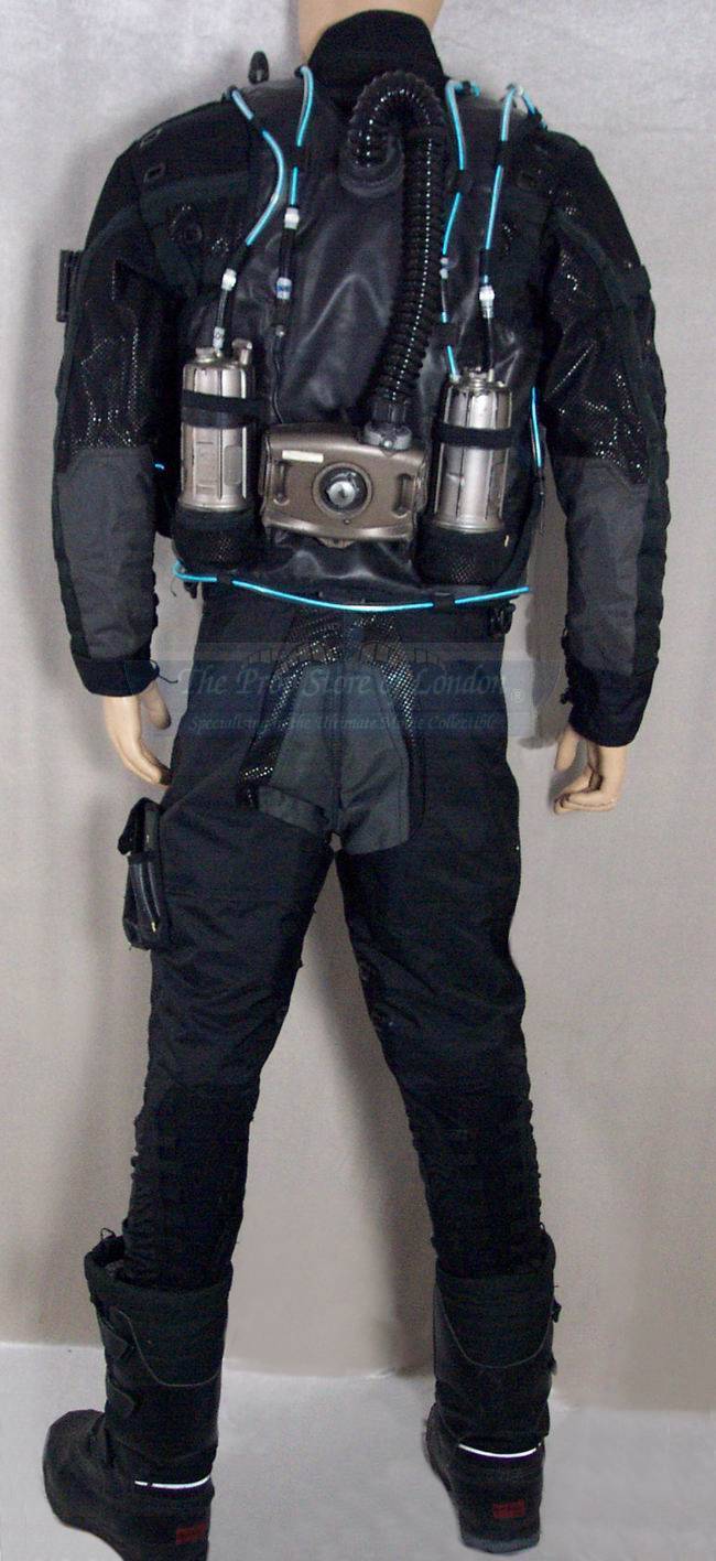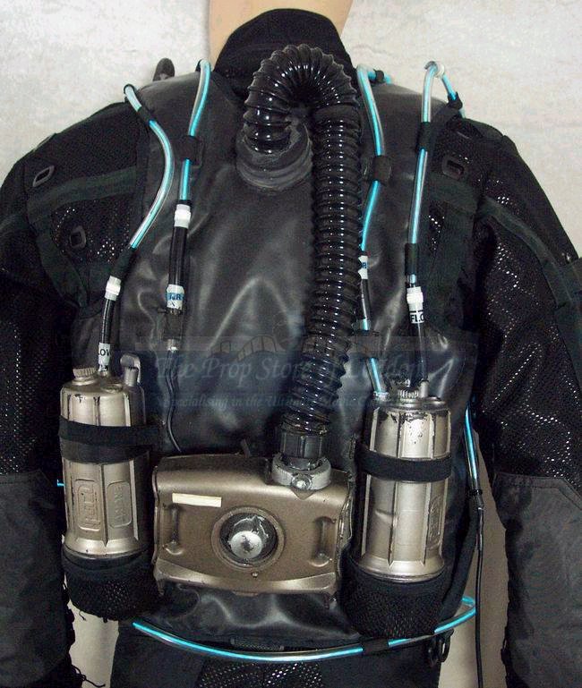 A tactical costume worn by Gary Oldman as Dr. Smith in the sci-fi movie Lost in Space. The costume consists of a rubberized vest that would have originally been a scuba divers which has been customized by the prop department. There is a large pipe on the back which connects to a rubber pack made to look like a fan. There are a series clear tubes running all around the edges of the jacket which light up neon blue when a switch is flicked on a power pack and there is a small working torch on each of the shoulders. Underneath the vest is a black jacket which fastens up the front with plastic clasps, has several pockets and is made from netting like material and strong waterproof material.