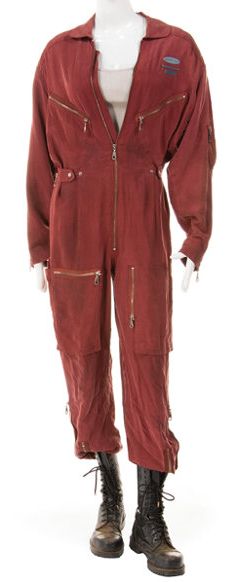 Heather Graham "Dr. Judy Robinson" ensemble from Lost in Space. ( New Line, 1998 ) Original ( 3 ) piece ensemble including ( 1 ) maroon silk coveralls with wide rounded collar, 3 blue painted metal plates affixed to left chest, 1 with "Jupiter Two", 1 with "Judy Robinson", and 1 with engraved barcode, multiple zipper and snap pouch pockets, snap waist cinchers, and zipper front closure, with ( 1 ) Diesel brand long-sleeve white ribbed crew neck shirt, and ( 1 ) pair Rangers brand black leather lace up boots with lug soles. Exhibiting intention studio soiling and production wear. In very good to fine condition. Provenance: New Line.