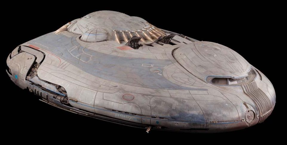 wide x 17 in. tall. Constructed of fiberglass with resin, styrene and wood elements, it features a realistically detailed hand-painted and airbrushed exterior to resemble a deep space-weathered hull. The ship is wired for illumination at the bow, cockpit and rear thrusters and when plugged in it makes for an impressive display. It exhibits some cracking and chipping but remains in remarkable condition.