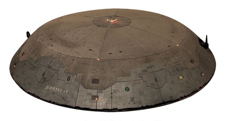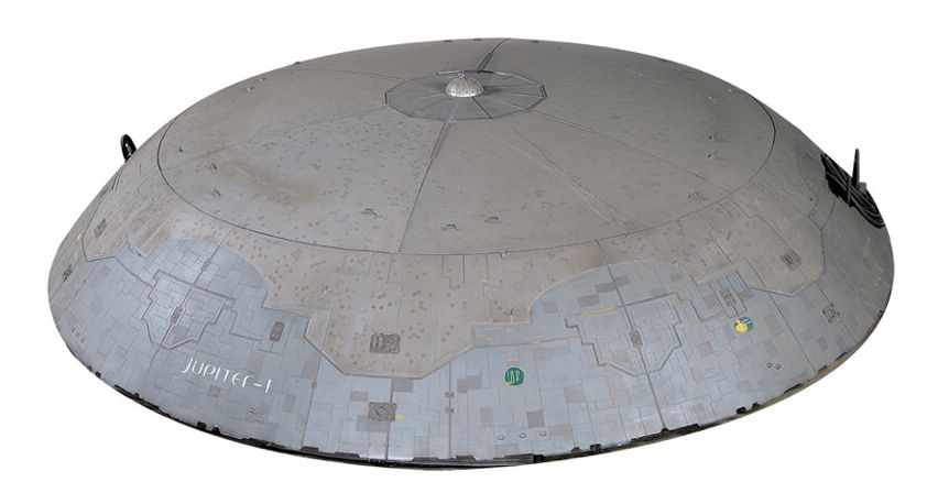 "Jupiter-1" 78 in. spaceship filming miniature from Lost in Space. ( New Line, 1998 ) The massive Jupiter-1 spacecraft was used to launch the smaller Jupiter-2 into orbit in the 1998 feature film. Intended to showcase the upper sections of the craft, the miniature measures 78 in. in diameter and is constructed with a steel substructure under a highly detailed resin hull hand etched and molded with high-tech detailing and painted in various shades of gray with silver accents. Labeled, "Allied Space Organization of Mexico America and Canada", "Jupiter-1", "A.S.O.M.A.C.", "Jupiter Mission", "J1" and "277-2211". The bottom portion of the saucer shaped craft is intentionally absent. Functional electronics illuminate areas of the sides and top of the craft. Two small sections that appear to be hangar doors are absent where hardware is installed for the ship to hang for display.