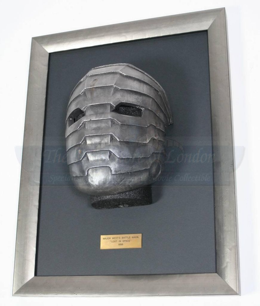 A replica mask as used in the William Hurt and Heather Graham film Lost in Space. The original film used version can be seen when Matt Le Blanc does battle with the giant spiders. Made from Fiberglass and painted a dull metallic grey this replica was molded from an original. Comes framed with a brass colored plaque stating ‘Major West's Battle Mask "Lost in Space" 1998'. The frame measures 52cm x 40 ( 20.5" x 15.75" )