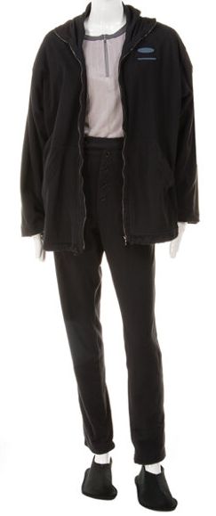 Mimi Rogers "Dr. Maureen Robinson" ensemble from Lost in Space. ( New Line, 1998 ) Original ( 4 ) piece ensemble including ( 1 ) black fleece hoodie with blue painted metal "Jupiter Two" and rectangular "Maureen Robinson" plates on left chest, oversized bias cut full hip pouch pockets, drawstring hem and zipper front closure, ( 1 ) pair matching pants with button front closure, ( 1 ) short sleeve collarless silver ribbed crop top with gray piping at half zippered neck, banded hem, and blue painted metal "Jupiter Two" and rectangular "Maureen Robinson" plates on left chest, and ( 1 ) pair black felt slippers. Exhibiting minor production wear. In very good to fine condition. Provenance: New Line.