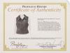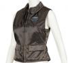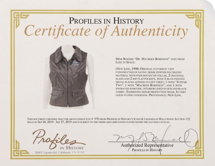 Mimi Rogers "Dr. Maureen Robinson" vest from Lost in Space. ( New Line, 1998 ) Original futuristic vest constructed of satiny dense pewter polyblend material with wide round tip collar, 2 diagonal slash and 2 hip flap pockets, with 3 blue painted metal plates affixed to left chest, 1 with "Jupiter Two", 1 with "Maureen Robinson", and 1 with engraved barcode, interior lined in quilted black fabric. Exhibiting minor production wear. In very good to fine condition. Provenance: New Line.