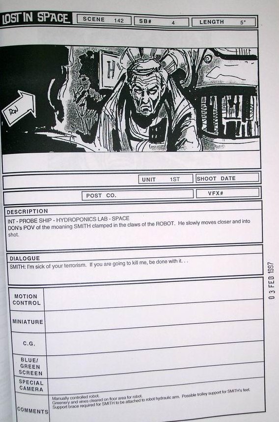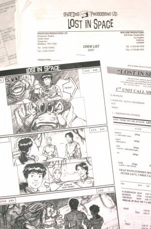 A set of production paperwork for the Gary Oldman and Heather Graham movie Lost in Space. The set consists of a complete script, 4 pages of Robot storyboards, a set storyboards with visual effects notes and a 9 page document entitled ‘Initial thoughts subject to change!'. All A4 size.