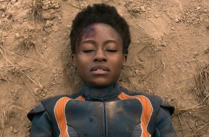 Angela wears her spacesuit as she escapes the Resolute but crashes and is discovered by Don West and Dr. Smith. Don and her then take cover during the storm before being rescued by the Watanabe family in "Diamonds in the Sky" ( S1, E2 ).