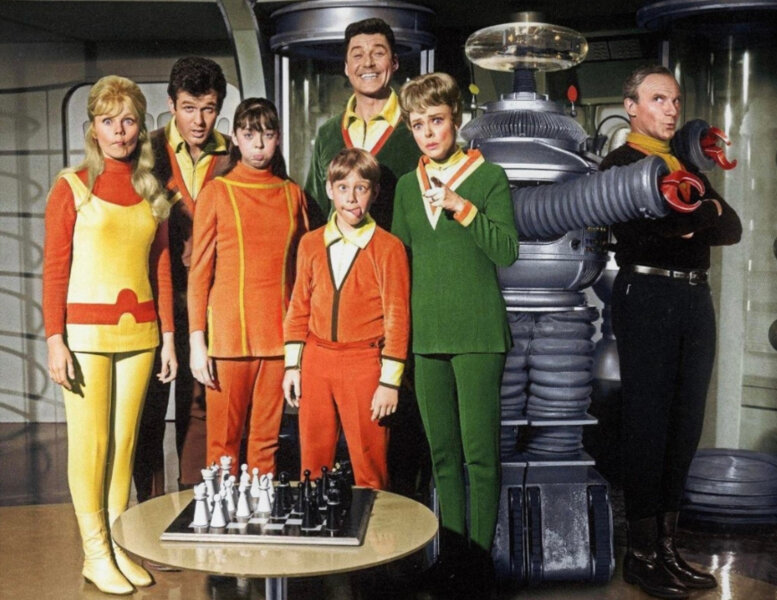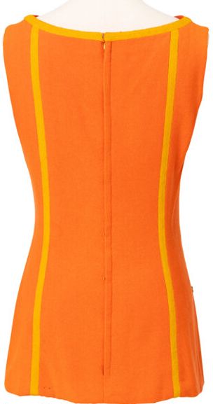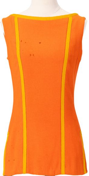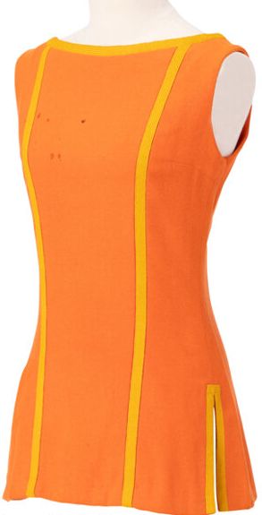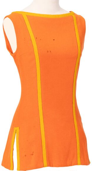 Lost in Space ( CBS TV, 1965 to 1968 ), Angela Cartwright Signature "Penny Robinson" Jumper from Season 2. Vintage original short orange wool jumper with yellow woven piping down the front and back, matching ring collar, 2-waist slits with matching piping, orange s atin lining, rear full length zipper, and rear hook and eye closures, retaining internal 20th Century Fox bias label. Penny Robinson ( Angela Cartwright ) is seen wearing this style orange jumper in all 30 Season 2 episodes of the beloved sci-fi family show. Other than her Season 1 parka and spacesuit, this is the only other Penny Robinson costume known to have survived. The jumper reflects the simple yet futuristic and distinctively '60s look of the costume design for the series, and was worn over an orange long sleeved shirt and orange pants to complete the ensemble. Exhibits signs of production wear and age, including stains to the front likely from makeup, some staining to the satin lining, and scattered moth holes. In 2023, Heritage Auctions sold a Bill Mumy "Will Robinson" Season 1 Lost in Space tunic for $200,000.