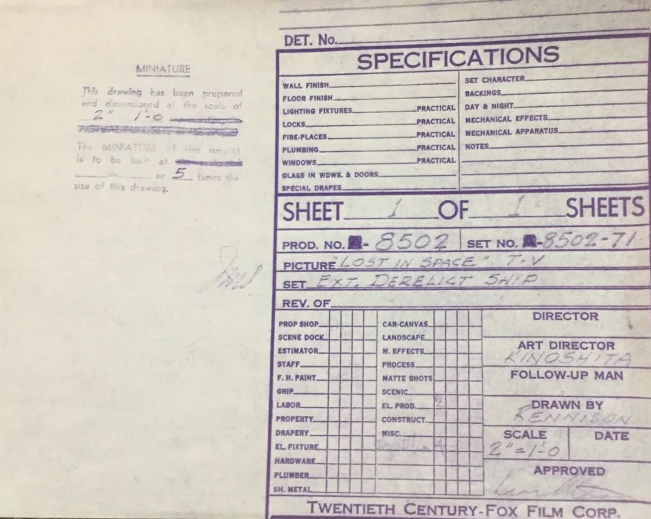 Great detail of Al ‘Zalto’ Lewis’ spaceship from the episode Rocket to Earth. Blueprint drawing measures 34 x 36 inches.Value: $1,000.