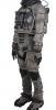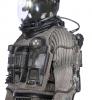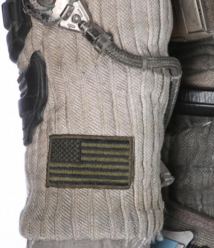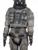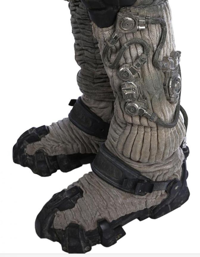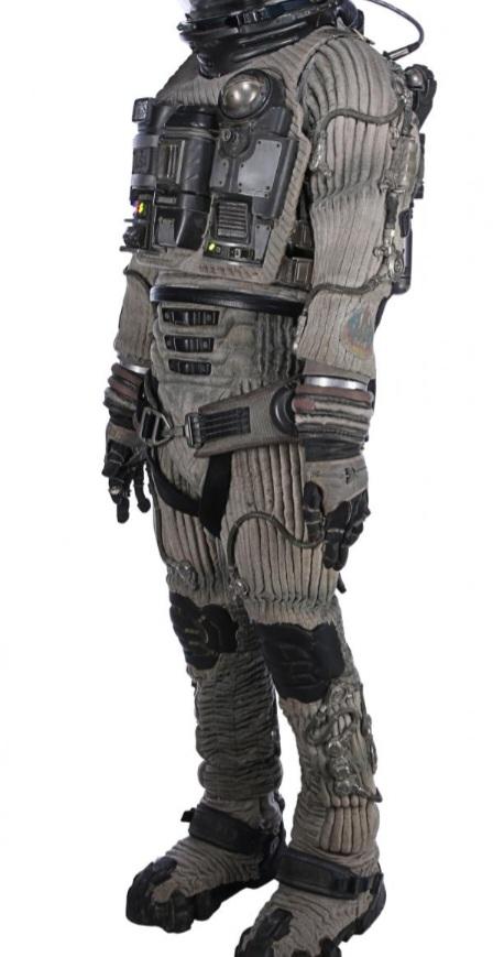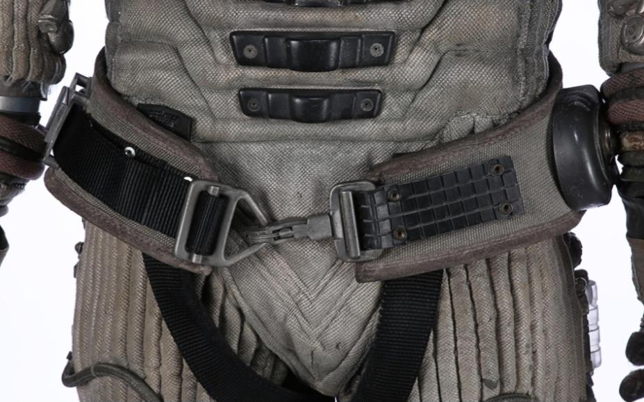 Constructed primarily from a heavy-weave, nylon-like material, the costume comprises a grey fiberglass helmet featuring a wide acrylic visor; a metal-and-resin collar; a front-and-back pack; a long-sleeved top and a pair of trousers that connect via a zip around the waist; a pair of gloves with metal locking rings; a utility belt; and a pair of modified Vans boots covered in dress-up components ( Labelled "Chick, Size 10" ).