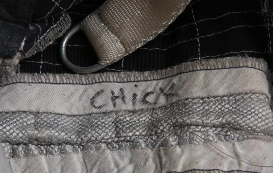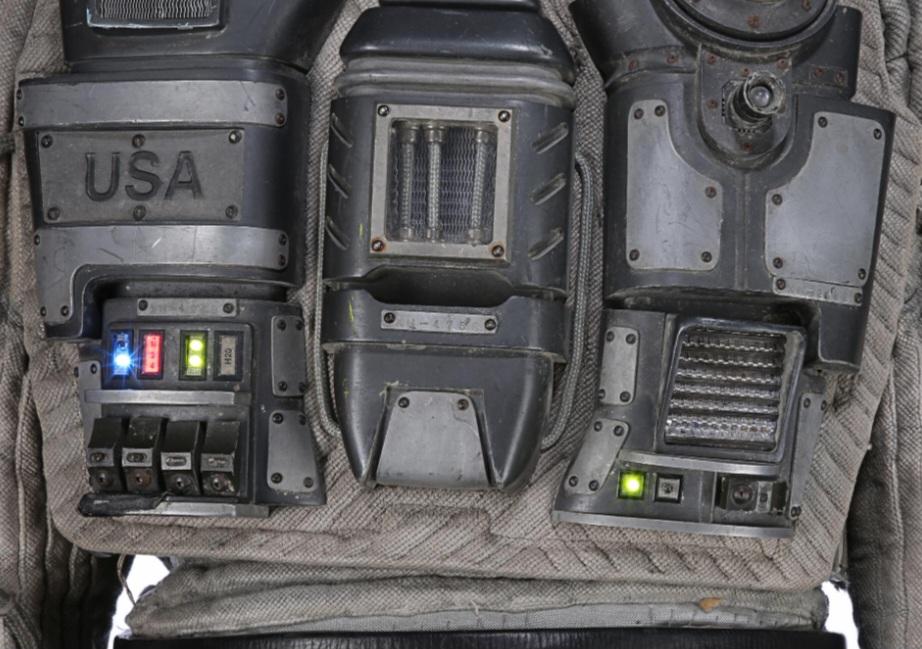 Most of the pieces have the character name "Chick" handwritten on the interior, and the suit features highly detailed metal, plastic and resin adornments. The backpack is marked "Ballast" and "Harry", suggesting that it belonged to Willis' character.
