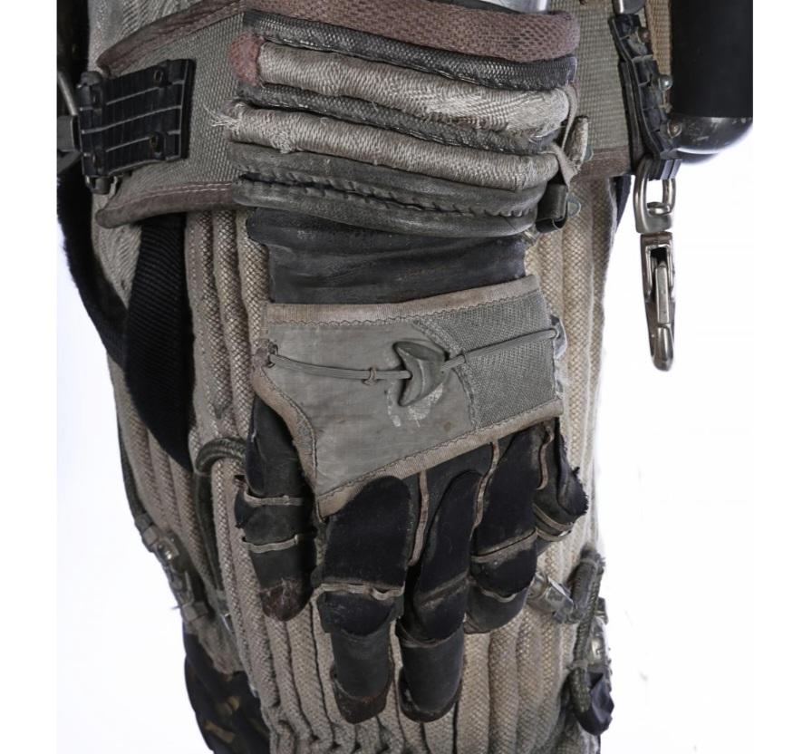Powered by an elaborate battery system, electronic components are fitted within the helmet, chest and backpack, allowing them to illuminate with multiple LEDs. Demisting fans are housed inside the pack, linking to the helmet to supply the wearer with plenty of air and ventilation while performing on set. The electronics can be powered by a 12V power supply, which is not included in the lot. The costume was intentionally distressed for production, and the gloves remain in a fragile condition.