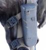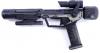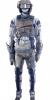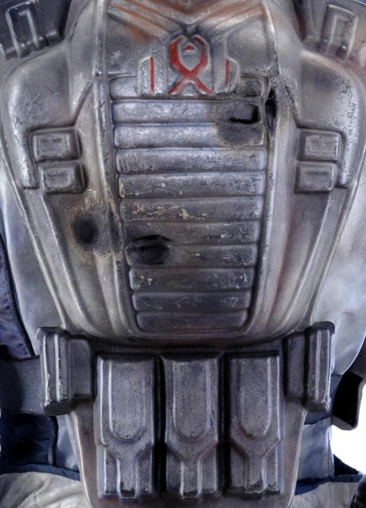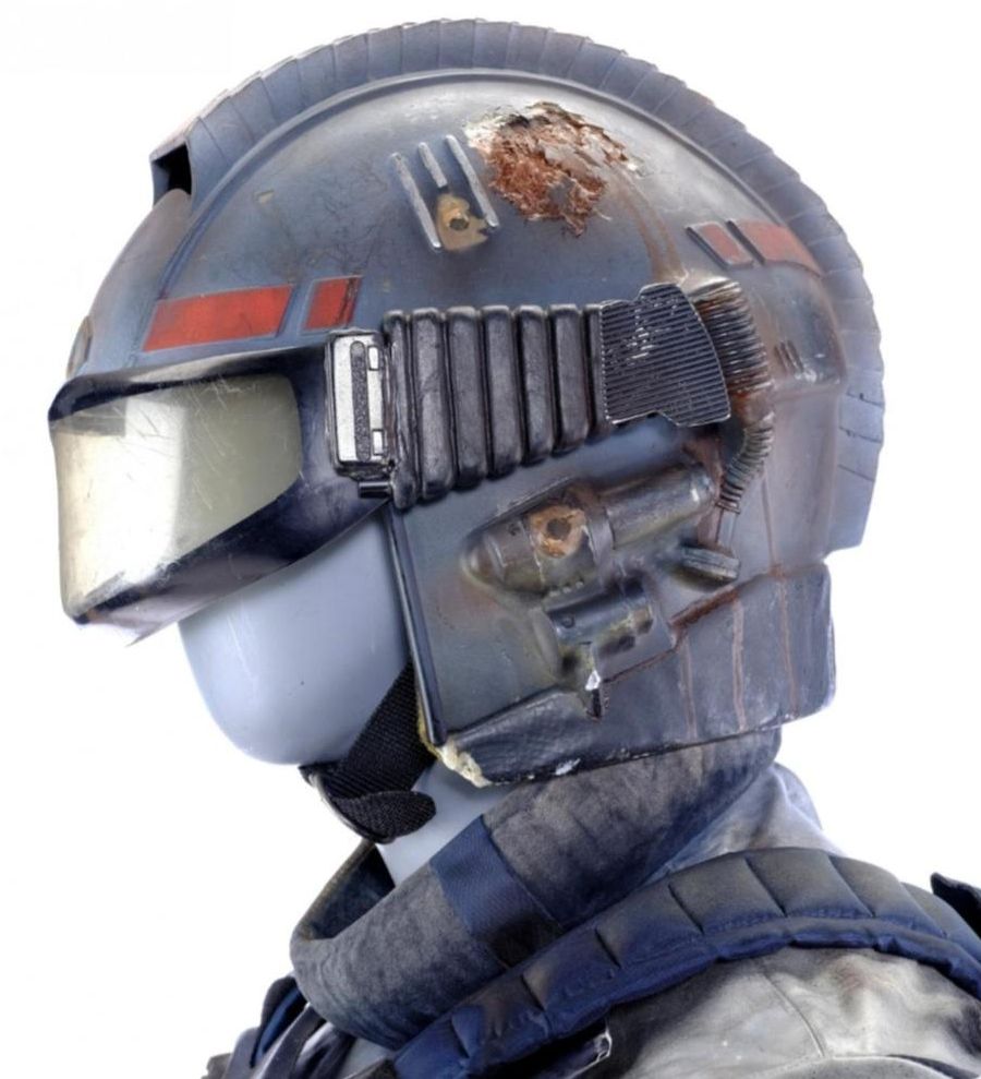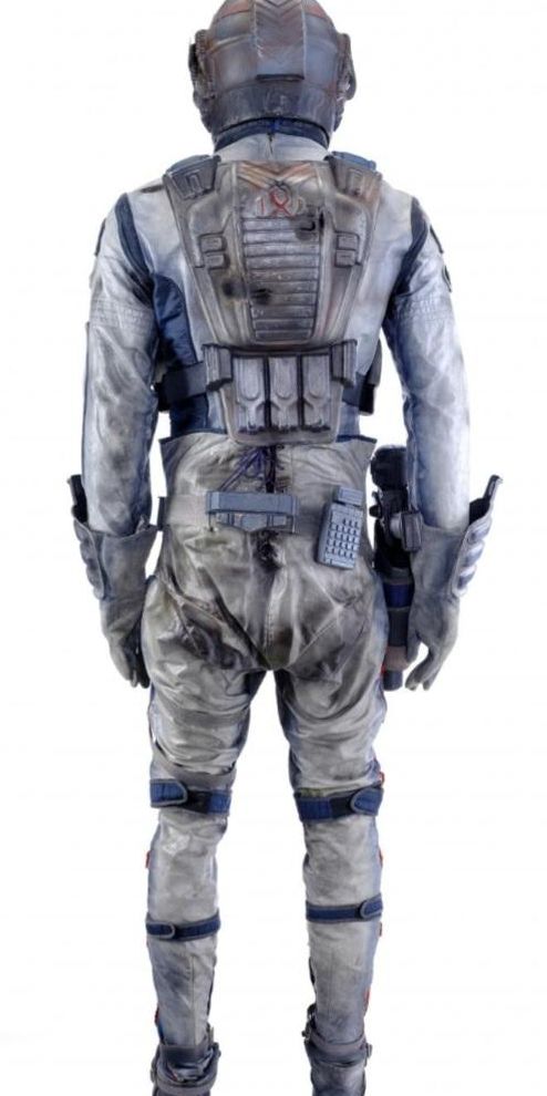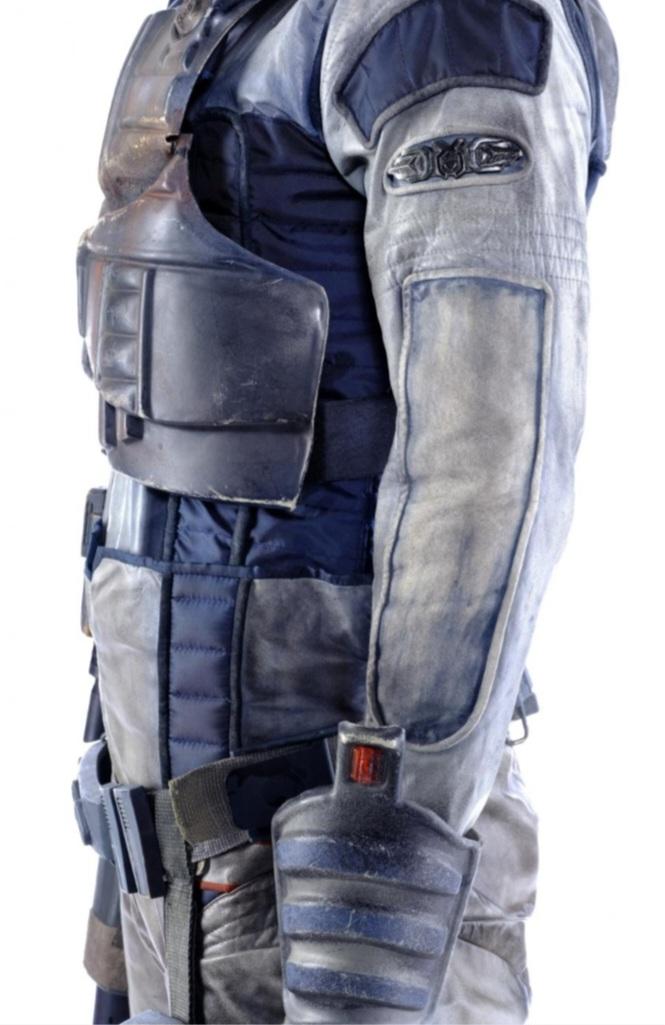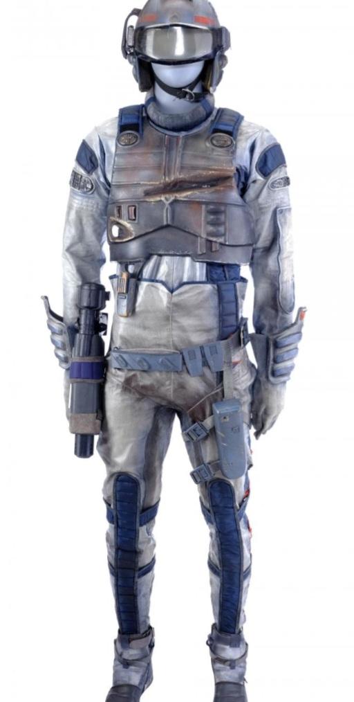 This costume consists of a grey plastic helmet with a transparent visor accent; a grey plastic chest armor piece with navy padded nylon straps; a grey and navy cotton, suede and leatherette jacket affixed with a unitard detail at the waist; matching trousers; a pair of grey suede gloves with grey and blue plastic accents at the wrists; a grey nylon belt with plastic details; a pair of grey leather and rubber boots; and a black rubber molded blaster. The costume exhibits signs of wear from age and use throughout, including discolored paint and some fraying.