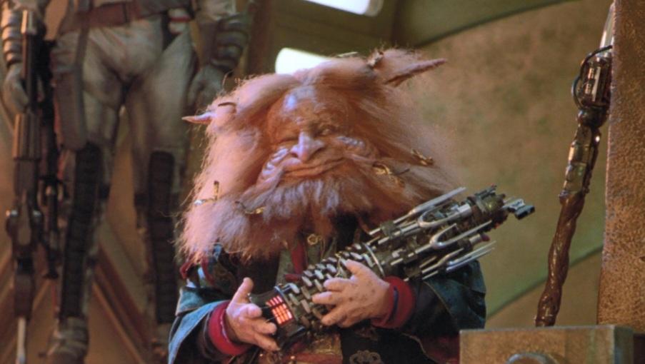 An Eternian soldier costume with a blaster from Gary Goddard's fantasy adventure Masters of the Universe. Eternian guards were seen in the aftermath of a battle with Skeletor's ( Frank Langella ) army. Later, Eternian soldiers stood guard at Castle Grayskull.